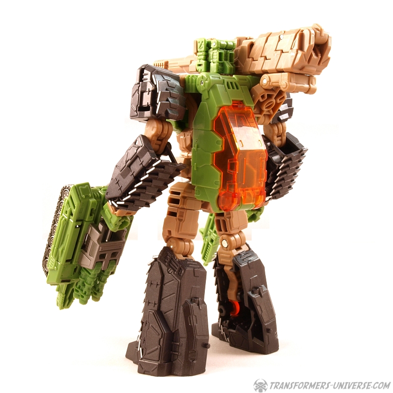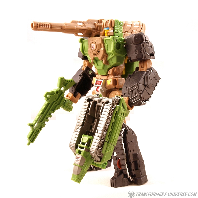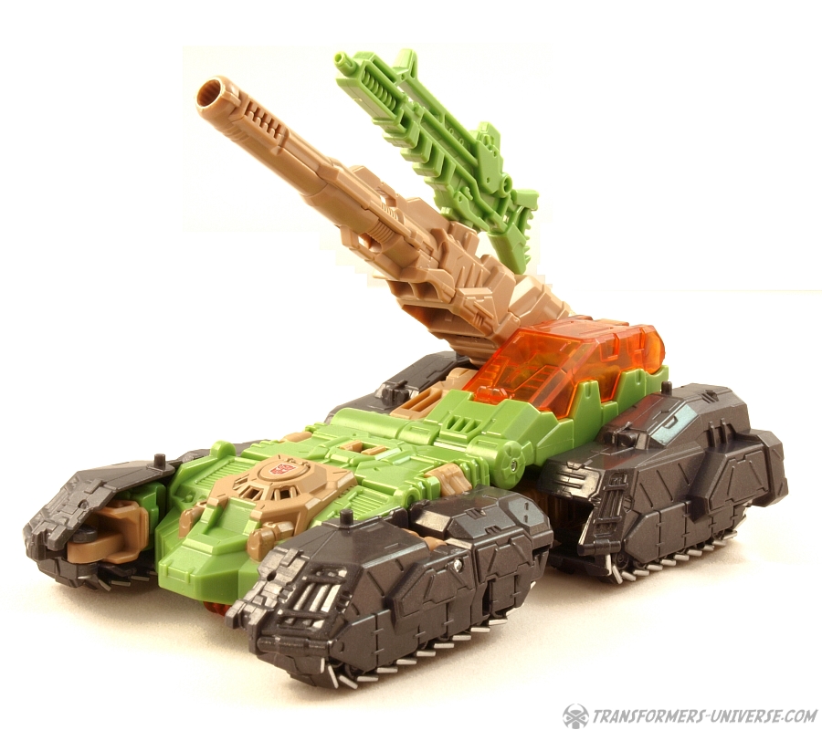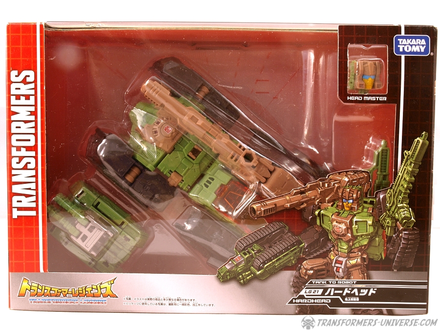 Remarks: In 2016 and 2017, Hasbro's Titans Return line had its own counterpart series in Japan, called Legends. Usually the Legends figures received a somewhat more "premium" paint job, often more cartoon accurate, and didn't bother to give individual names to the Headmaster figures (and they did call them Headmasters instead of Titan Masters). Another example of this trend is Hardhead, who is mostly identical to his Titans Return counterpart (and uses the same mold as Titans Return Quake), but also carries the converting tank (called 'Tankette') that came with the Titans Return Terri-Bull, repainted to match Hardhead's colors.