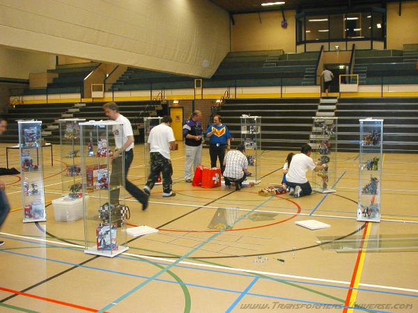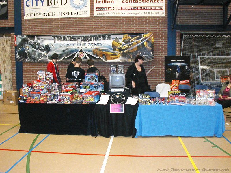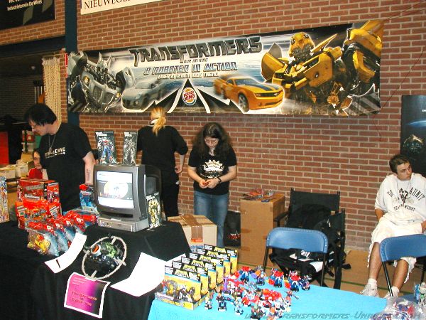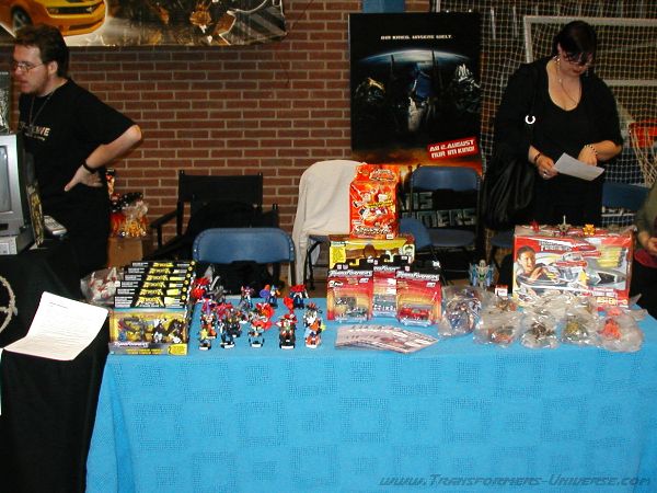 Dann aber der Aufbau. Fünf ziemlich mickrige Tische wurden zusammengeschoben und mit ein wenig Stoff präsentabel gestaltet. In die Mitte kam ein tragbarer Fernseher, auf dem dann den Rest des Tages immer die selben drei Videos laufen sollten. Übrigens vielen Dank, Scourge, dass ich den TF Movie Soundtrack jetzt erstmal für ein paar Wochen weglegen muss, denn sonst würde ich die Scheibe mit Sicherheit aus Überdruss an der Wand zerschmettern.