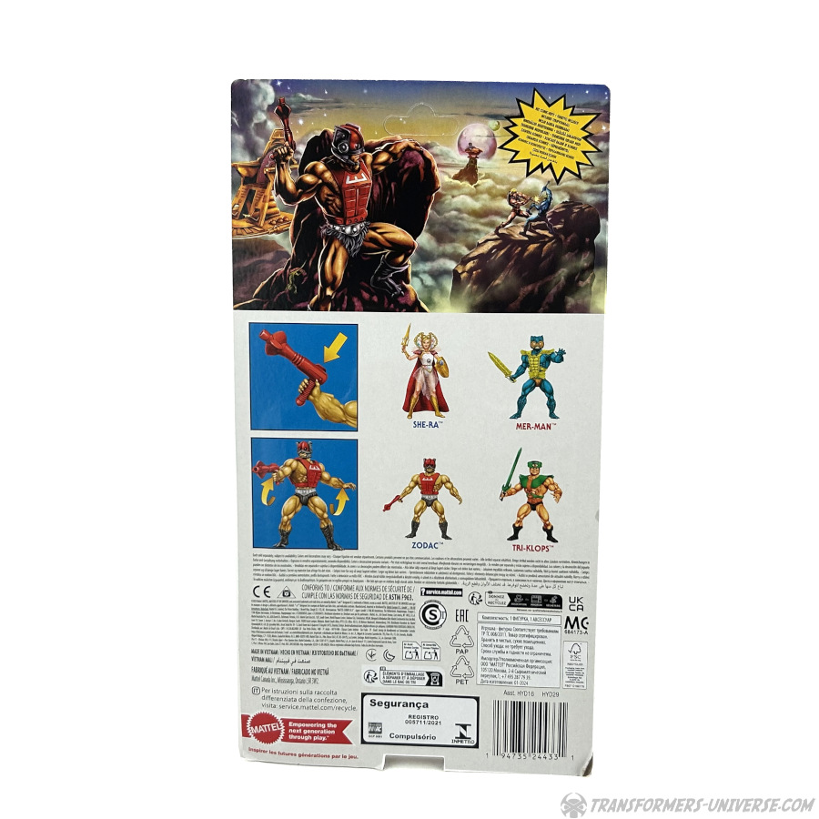 Review: Die originale Zodac Figur war die Standard-Master Figur der frühen Wellen, also mit abnehmbaren Brustharnisch und einer Waffe dabei. Obwohl er menschlich erschien, hatte er die Klauenfüße, die eigentlich den Bösen vorbehalten waren. Auch war er die erste Masters Figur, die eine Feuerwaffe dabei hatte, anstatt einer primitiven Nahkampfwaffe.