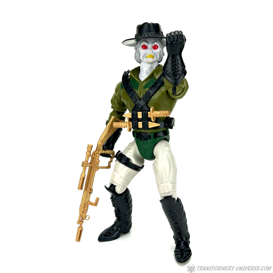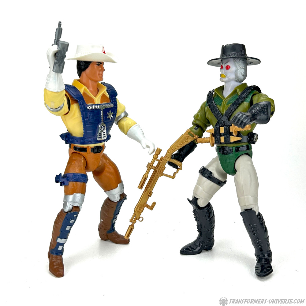 Tex Hex: Wie es oft bei den Bösewichtern aus Cartoon Spielzeugreihen der Fall ist, ist der Bösewicht mehr oder weniger das dunkle Spiegelbild des Helden. Wo also Marshall Bravestarr der gute Cowboy in den hellen Klamotten ist, ist Tex Hex der böse Cowboy mit den dunklen Klamotten. Der Körper ist der gleiche wie der von Bravestarr, nur mit dunkleren Farben, leicht abgewandelten Handschuhen und einem neuen Kopf. Außerdem trägt er einen anderen Hut und einen anderen Brustpanzer samt rausziehbaren Dolchen. Die Waffen wiederum sind die gleichen, eine Handwaffe und ein Gewehr, nur jetzt goldfarben anstatt silbern. Meinem Tex Hex fehlt die Handwaffe, aber ansonsten ist er komplett.