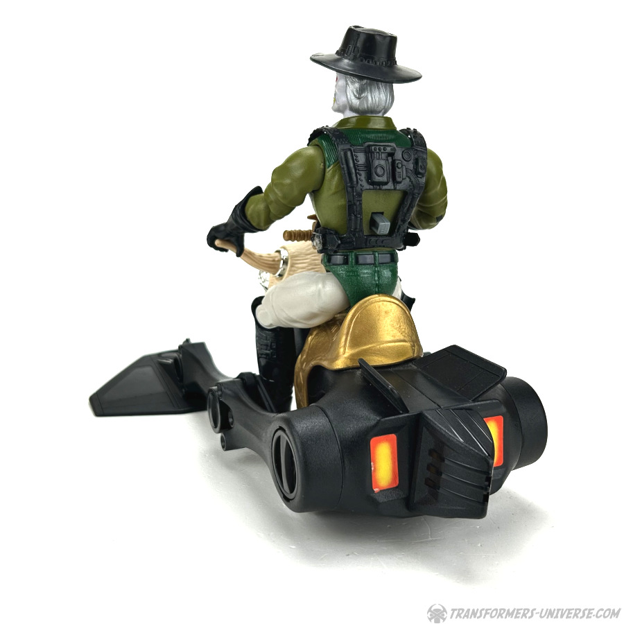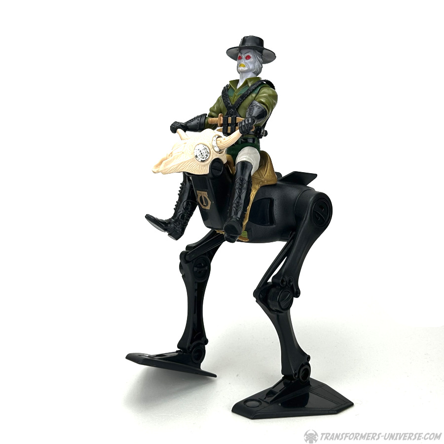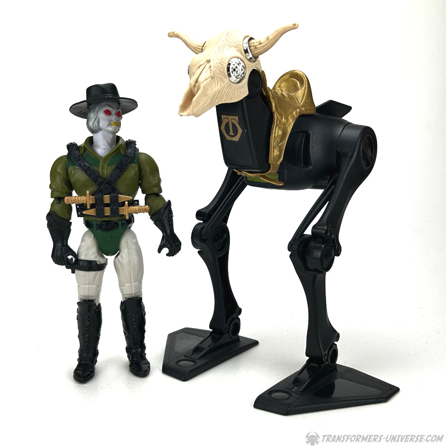 Skull Walker: Die Bravestarr Reihe war eine etwas abgefahrene Sci-Fi Western Serie, somit hatten wir fliegende Postkutschen, gezogen von Roboter-Kühen, Roboter-Pferde, und mechanische Geher mit Kuhschädeln oben drauf. Der Skullwalker, Tex Hex Fahrzeug der Wahl, ist im Prinzip nur ein großes Paar Beine, verbunden mit einem Sattel, wo der schon erwähnte Schädel oben drauf ist. Der Geher ist größtenteils schwarz und die Beine können über einen drehbaren Knopf hinten bewegt werden. Außerdem gibt’s eine Art Flugmodus, bei dem man die Beine nach vorne klappt.
