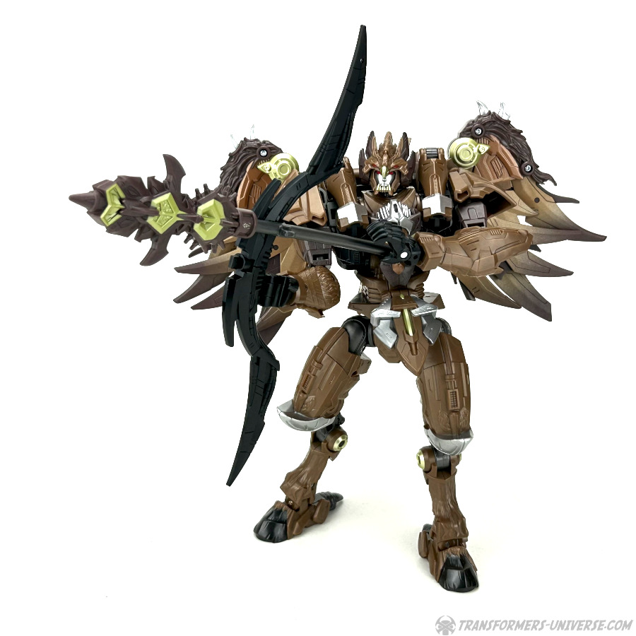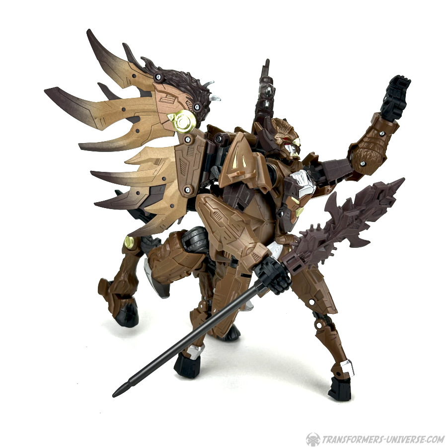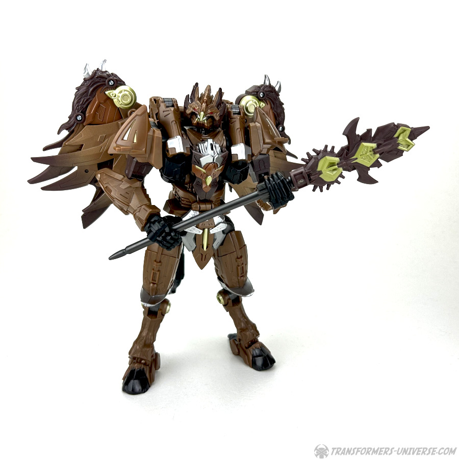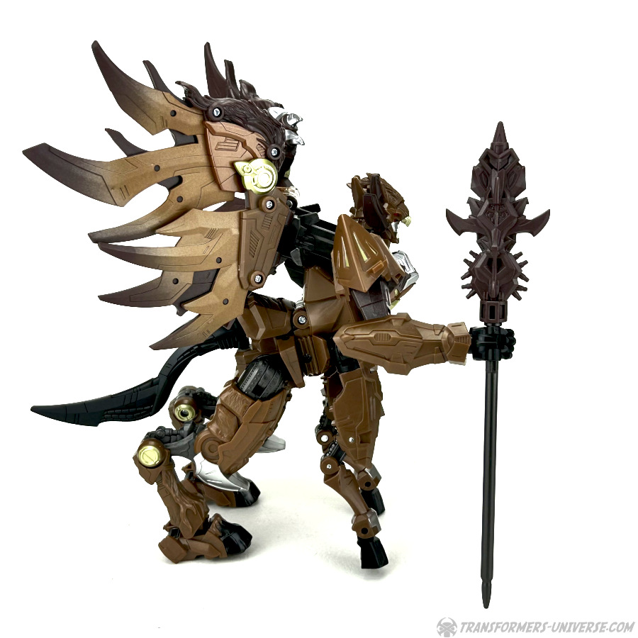 Onyx Prime hat ein humanoides Gesicht in einem Vogel-Helm und man kann das Gesicht „hochklappen“, um eine animalische Kampfmaske zu kriegen. Seine Hauptwaffe ist ein Speer, dessen vorderes Teil der Triptych Maske nachempfunden ist, einem McGuffin… äh… einem Artefakt der Primes. Der Speer kann auch als Pfeil dienen, da Onyx‘ Schwanz zu einem Bogen aufklappt. Der Speer/Pfeil kann in den Bogen einklicken, der wiederum in die Hände einklickt, so dass alles stabil sitzt.