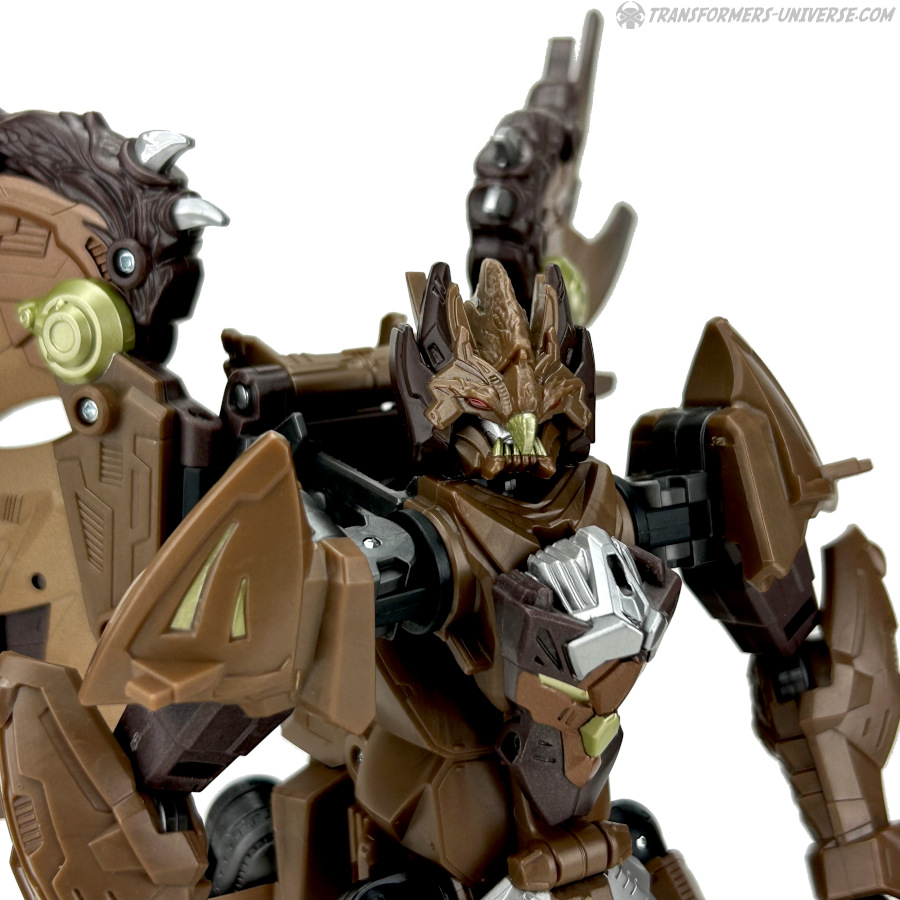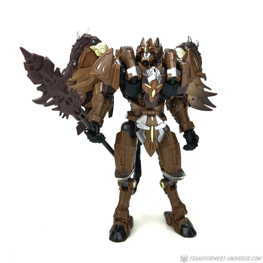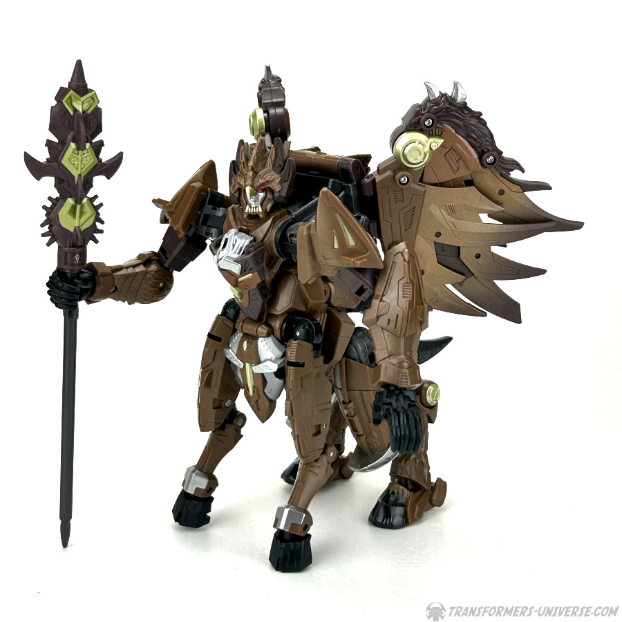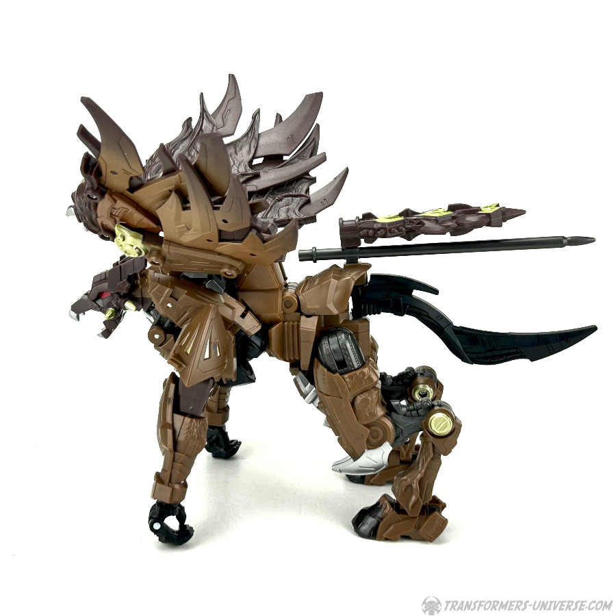 Onyx Prime hat ein humanoides Gesicht in einem Vogel-Helm und man kann das Gesicht „hochklappen“, um eine animalische Kampfmaske zu kriegen. Seine Hauptwaffe ist ein Speer, dessen vorderes Teil der Triptych Maske nachempfunden ist, einem McGuffin… äh… einem Artefakt der Primes. Der Speer kann auch als Pfeil dienen, da Onyx‘ Schwanz zu einem Bogen aufklappt. Der Speer/Pfeil kann in den Bogen einklicken, der wiederum in die Hände einklickt, so dass alles stabil sitzt.