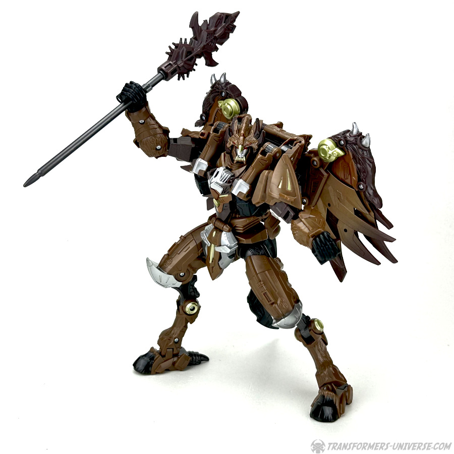 Die Beweglichkeit des Roboters hingegen gibt keinen Grund zur Beschwerde. Und führt uns zu seinem interessantesten Feature: man kann den Roboter entweder als normalen Zweibeiner konfigurieren oder als eine Art Zentauren, ein humanoider Torso auf einem vierbeinigen Unterleib. Persönlich gefällt mir die Zentauren-Variante besser, allein schon weil wir bisher glaube ich keinen Transformer mit einem solchen Design hatten, aber wie Ihr wollt. Ob man ihm jetzt zwei oder vier Beine verpasst, die Beweglichkeit ist sehr gut. Eine Einschränkung allerdings: wenn man seine Hüfte drehen will (im Zweibeiner Modus), muss man seinen Lendenschurz komplett nach vorne klappen. Die Flügel auf dem Rücken sind auch voll beweglich, können vor und zurück bewegt, sowie aufgefächert werden. Sehr schön.