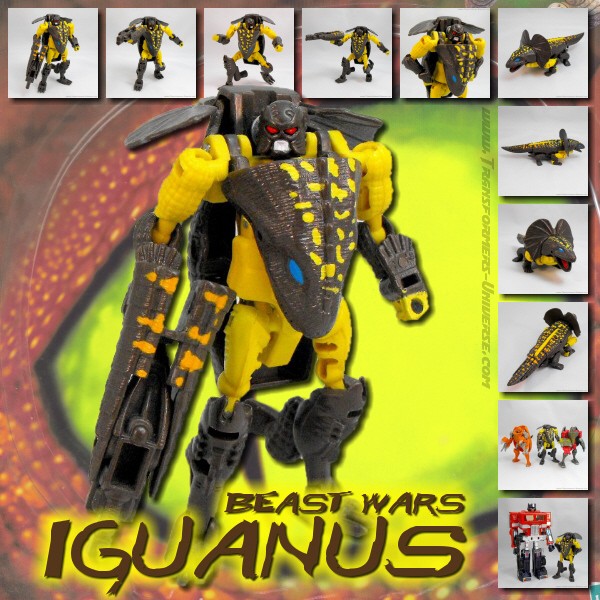 Iguanus ist eine mehr oder minder durchschnittliche Beast Wars Figur für das erste Jahr dieser Spielzeugreihe. Was bedeutet er ist hochgradig beweglich dank Kugelgelenken, hat eine für seine Größe verdammt gute Detaillierung und besitzt die gleiche Standard-Transformation wie die meisten frühen Beast Wars Figuren (der Tierkopf landet auf der Brust). Seine Waffe ist ein (für seine Verhältnisse) sehr großes Gewehr, welches aus dem Tierschwanz entsteht. Und... ja, das ist’s eigentlich auch schon, was mir dazu einfällt. Ein schön gemachter Robotermodus, aber im Vergleich mit anderen Basic-Klasse Beast Wars Figuren jetzt nichts Besonderes.