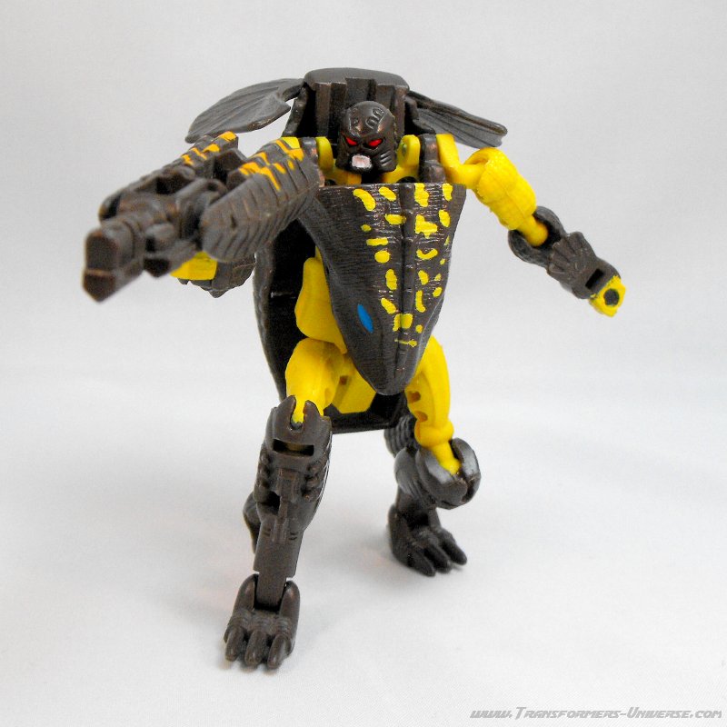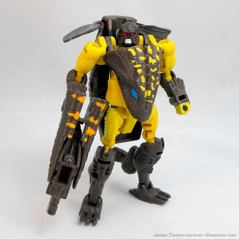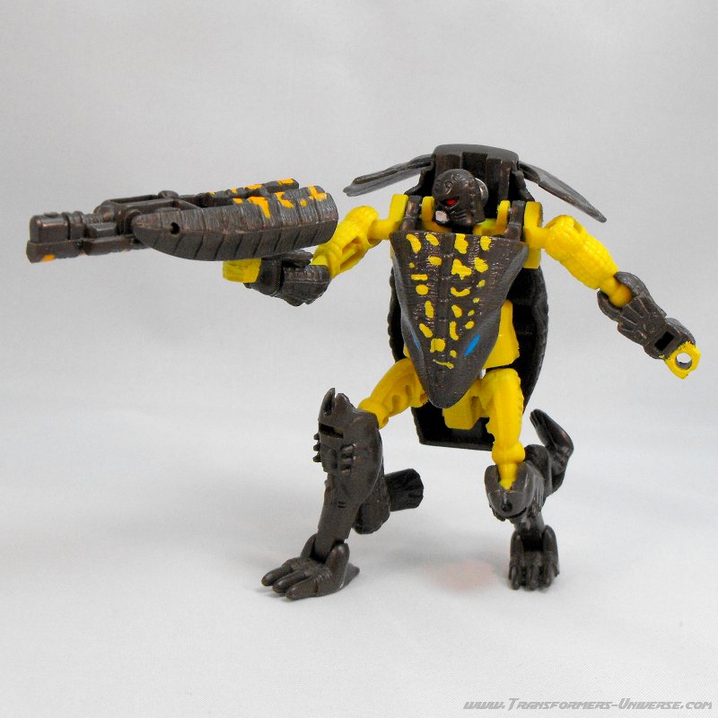 Robotermodus: Man merkt es nicht auf den ersten Blick, aber Iguanus ist ein umfangreich verändertes Repaint von Beast Wars Basic Megatron (bzw. Megatron von ihm, die Figuren kamen zeitgleich raus). Er hat einen komplett anderen Kopf (im Roboter- und Biestmodus) und andere Farben, aber der grundlegende Körper ist der selbe, ebenso wie die Waffe.