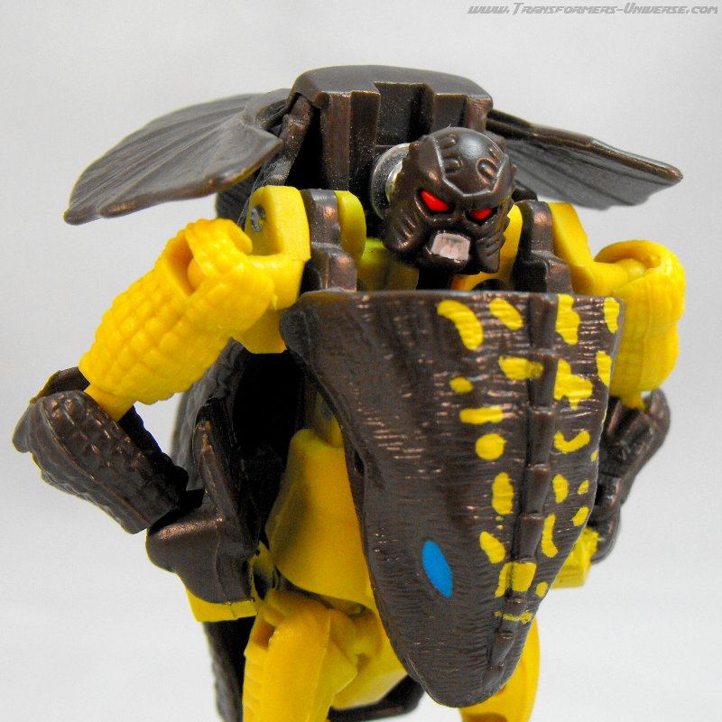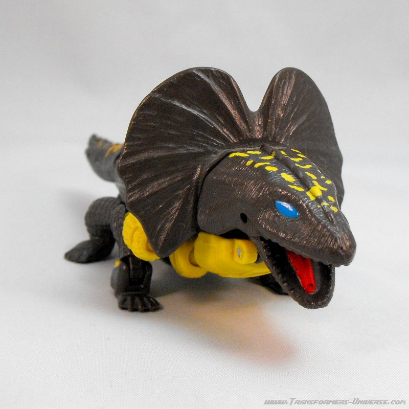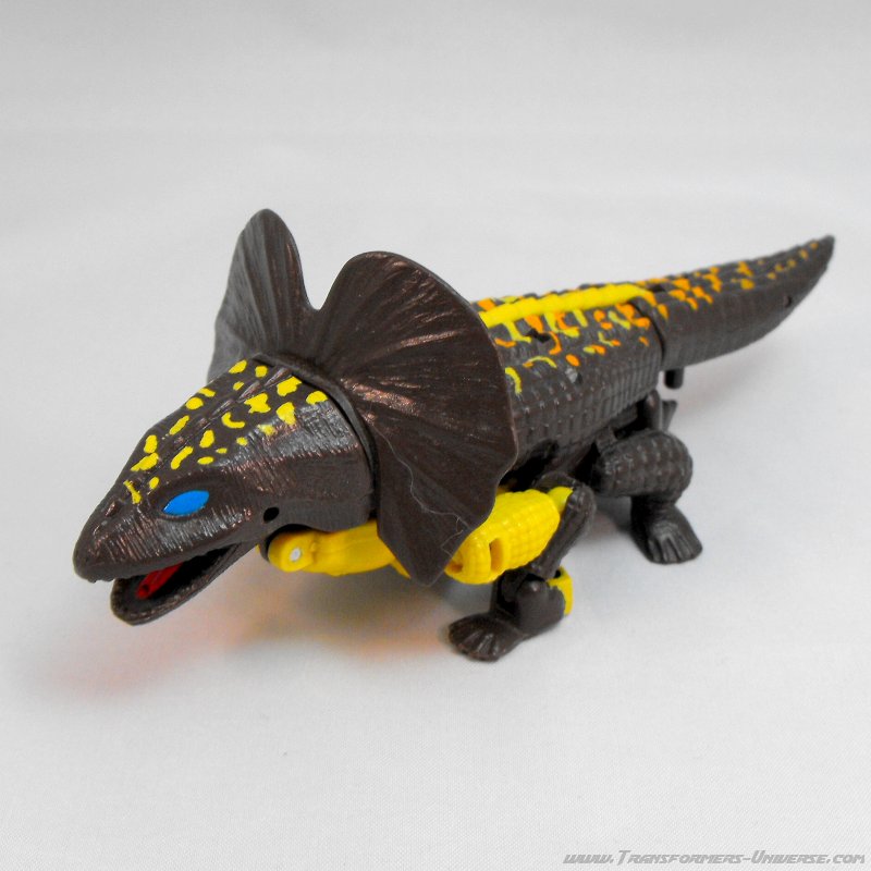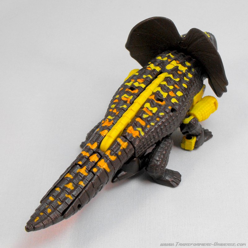 Biestmodus: Iguanus verwandelt sich... nicht in einen Leguan (engl. iguana), sondern stattdessen in eine Kragenechse (Chlamydosaurus kingii für die Lateinliebhaber). Okay, beide Tiere gehören zu den sog. Leguanartigen (Iguania), aber die eigentlichen Leguane (Iguanidae) sind eine andere Gattung als die Agamen (Agamidae), zu denen die Kragenechse gehört. Ist natürlich nicht wirklich wichtig, aber ich suche so was gerne mal bei Wikipedia raus und gebe dann mit der 1 an, die ich in Bio immer hatte, lange bevor es so was wie Wikipedia überhaupt gab. Machen wir weiter. Die Transformation vom Tier zum Roboter geschieht per Sprungfeder fast automatisch, man muss lediglich den Schwanz aushaken. Umgekehrt hebt man einfach den Echsenkopf hoch, bis er in den Kragen einrastet und ist fast fertig.