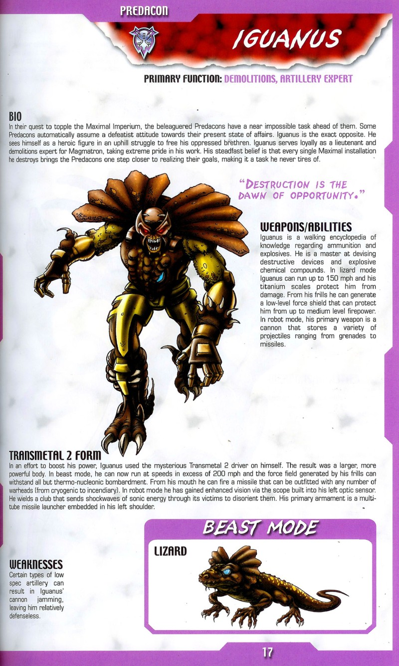 Eine Echse wie keine zweite; seine internen Intelligenzprozessoren sind speziell für Sabotageakte ausgelegt. Wenn Optimus Primal in der Nähe eines Predacon Außenpostens einen Infrarotdetektor installiert, dann baut ihn Iguanus so um, dass er beim Anschalten in die Luft fliegt. Seine Schuppen sind mit Titanium gepanzert, was ihn vor Laserfeuer schützt.