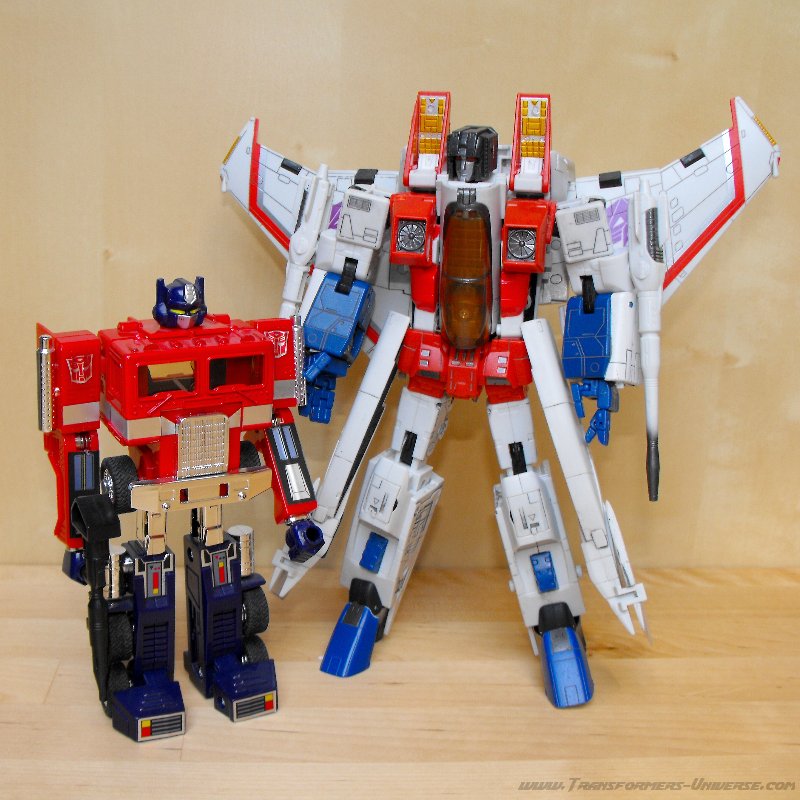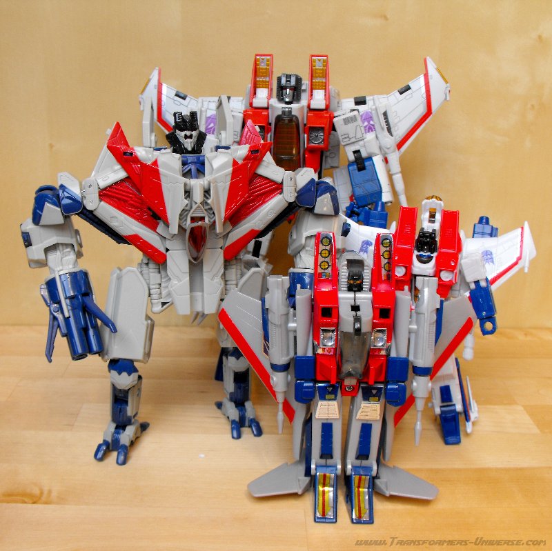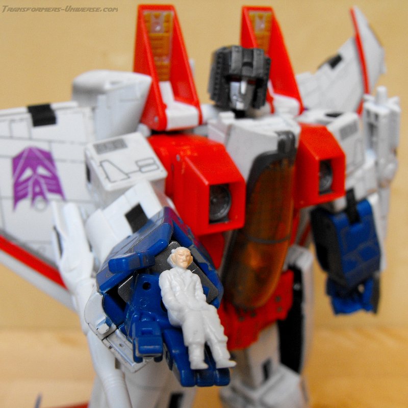 Bemerkungen: Um die etwas wirre Geschichte dieses Spielzeugs kurz aufzurollen: In 2006 brachte Takara eine grüne Version dieser Figur ("Greenscream") als Teil der Masterpiece Reihe raus (zu der Zeit erst der zweite Mold dieser Reihe). Das verwirrte viele Fans, da es Takara normalerweise ja sehr mit den G1-akkuraten Farben hält. In 2007 korrigierte Hasbro diesen Fehlern (wenn man es denn so bezeichnen will) und brauchte diese Figur hier mit G1-Farben und einigen minimalen Modifikationen als Teil der laufenden Classic-Serie raus. Nur kurze Zeit später zog Takara nach und brachte den G1-farbenen Starscream auch in der Masterpiece Reihe raus. Diese Figur wurde seitdem mehrfach wiederverwendet, als Skywarp, Thundercracker und Ghost Starscream.