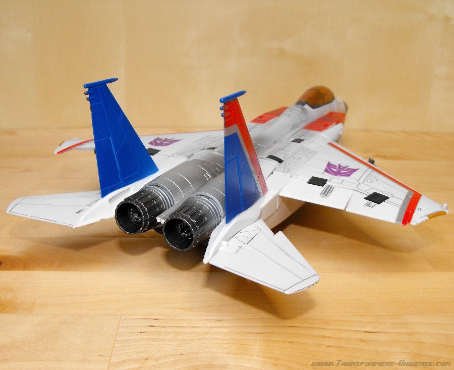 Die Verwandlung in diesen Modus ist relativ kompliziert (wenn auch nicht so sehr wie die von Masterpiece Megatron), aber das Resultat kann sich sehen lassen und es gibt keine sichtbaren Roboterteile. Der Jet wirkt sehr schnittig und trotz dem größtenteils weißen Anstrich sieht man sehr viele Details. Die Nähte und weitere Details wurden dunkel hervorgehoben, damit man sie besser sieht. Sehr schön. An der Seite des Cockpits sieht man ein Symbol, welches an die Krone erinnert, die Starscream während seiner sehr kurzen Regentschaft als Decepticon Anführer im 1986er Transformers Kinofilm trug.