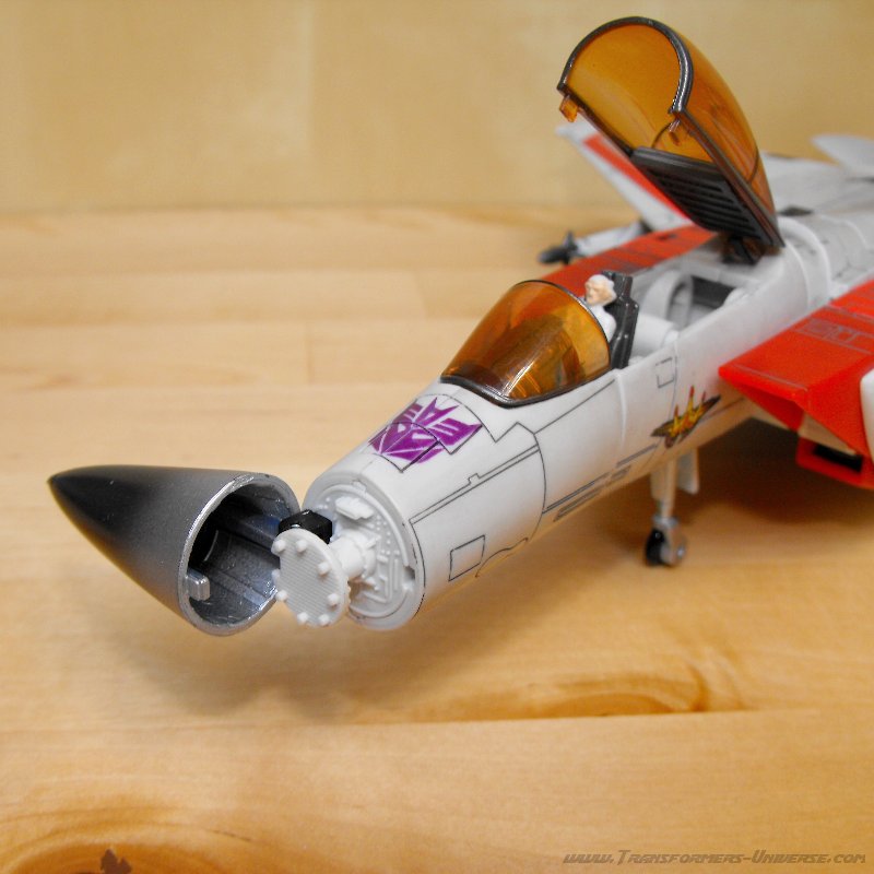 Vom tollen Look mal abgesehen bietet der Jet auch einiges zum Anfassen. Er hat ein funktionierendes Fahrgestell; das Cockpit öffnet sich und man kann Dr. Arkeville darin platzieren; bei den Triebwerken hinten gibt es aufklappende Paneele und man kann entweder die Raketen oder Starscreams Nullray-Kanonen unter den Flügeln montieren. Ach ja, und die Nase des Jets klappt auf, um den Blick auf das Radargerät freizugeben.