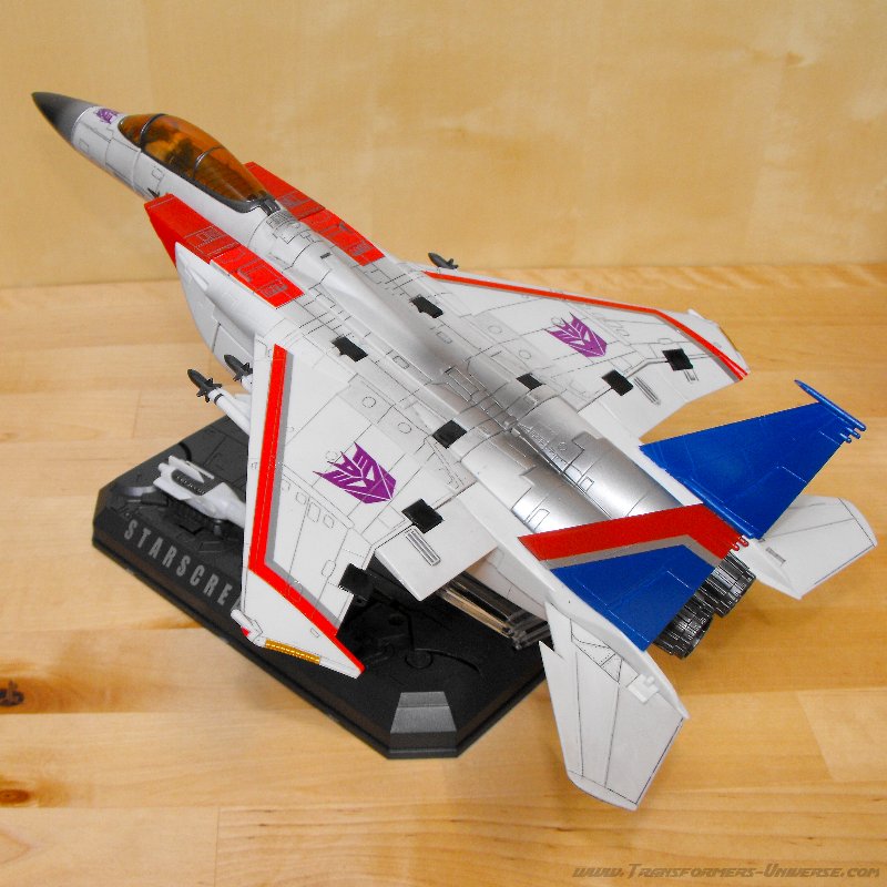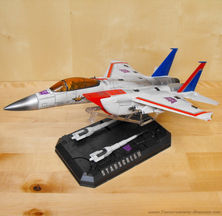 Außerdem hat Starscream ein Podest dabei, auf dem sein Name eingraviert ist. Er kann im Robotermodus darauf stehen oder im Jetmodus auf einem durchsichtigen Ausleger darauf montiert werden. Das Podest hat außerdem Platz, um seine Nullray-Kanonen zu verstauen.