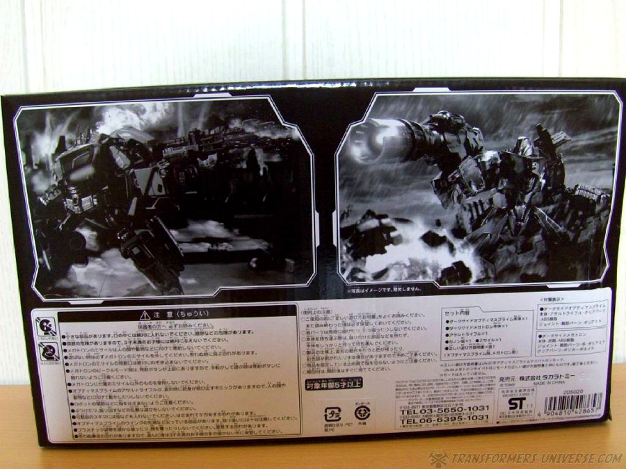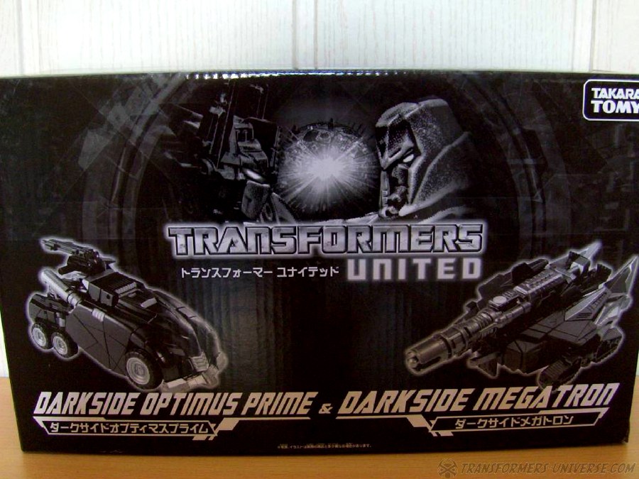 Vorwort: Nach den bekannten und sehr beliebten eHobby United 3-Packs nun das zweite exklusive Box-Set, diesmal als 2-Pack bestehend aus War for Cybertron Optimus Prime und Megatron als Black/Darkside Version. Dieses Set war, soweit bekannt, limitiert auf 5000 Exemplare und wurde vornehmlich auf der Tokyo Toy Show 2011 verkauft und war dort auch innerhalb der ersten Stunde ausverkauft. Ein kleiner Teil war des Weiteren über den bekannten online Shop eHobby erhältlich. Die Box ist den vorangegangen 3-Packs sehr ähnlich gehalten, also Schwarz mit nur wenigen Bildern. Innen befinden sich neben den beiden Figuren nur ein Plastikschuber in dem beide Figuren mit den üblichen Kabelbindern befestigt sind, sowie eine Tüte mit den Anleitungen für beide. Sonst leider nichts, keine Collectors Card oder Spielzeugkataloge. Schade, aber man kennt es ja. War bei den 3-Packs ja auch nicht anders.