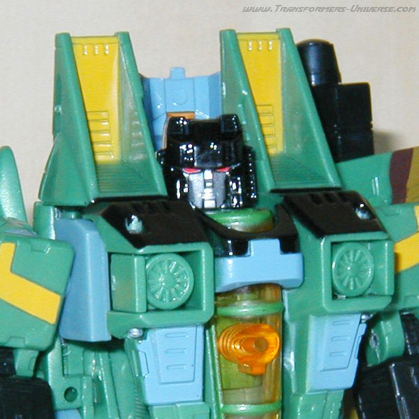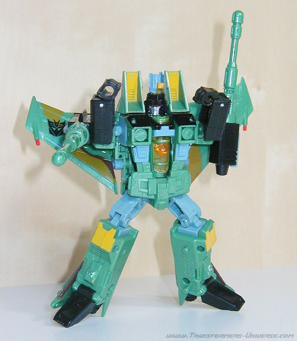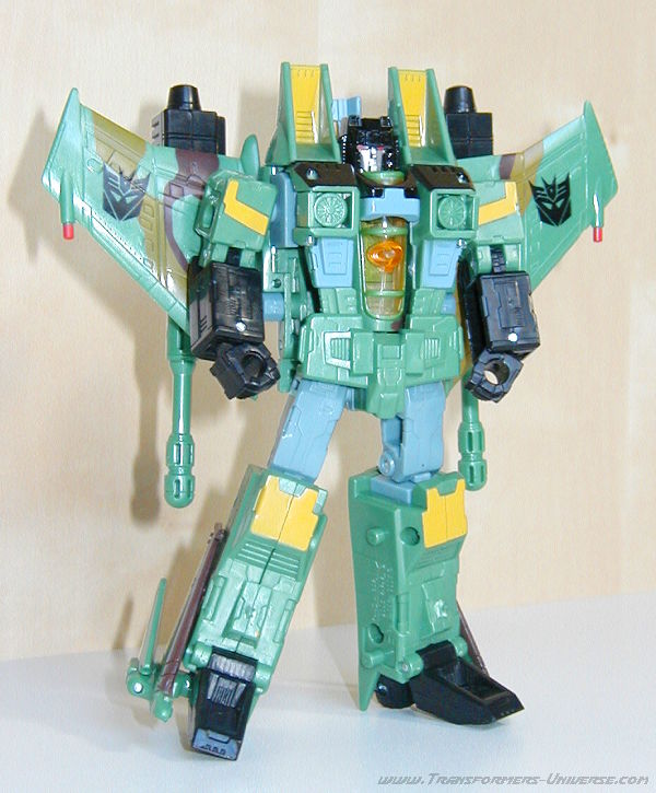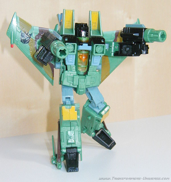Robotermodus: Wie geil diese Figur einfach ist! Hier hat man den perfekten G1 Seeker in seiner Vollendung. Alles passt und da schlägt mein Herz höher. Cockpit auf der Brust und die beiden Flügel, die von den Seiten abstehen. Echt klasse. Die grüne Lackierung mit dem Tarnmuster macht viel her und haucht der Figur Leben ein. Für mich hatte Acid Storm sofort Charakter und Leben, als er das erste Mal im Robotermodus vor mir stand.