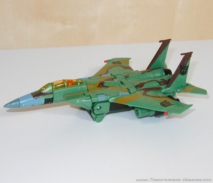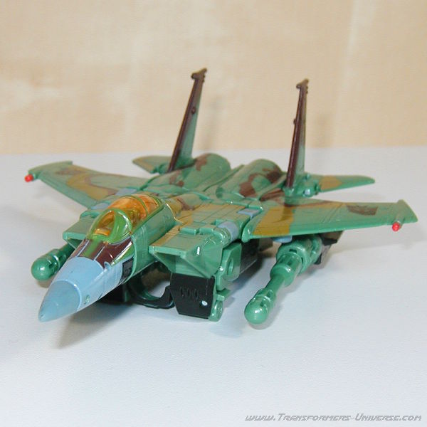 Fahrzeugmodus: Und dieser Modus ist meiner Meinung nach perfekt. Man kann überhaupt nicht erahnen, dass sich hier ein Roboter hinter versteckt. Selbst von unten nicht. Hier haben viele Flugzeugtransformer ihr großes Problem, indem der Botmodus irgendwie sinnlos unten dran hängt und man nicht weiß wohin mit Armen und Beinen. Das klassische Design des G1 Seekers hatte dieses Problem schon längst gelöst und es funktioniert prächtig.