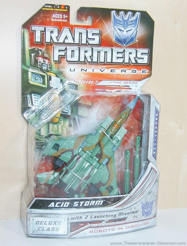 Bemerkung: Tatsächlich tauchte Acid Storm nur in der Folge "Divide & Conquer" auf. Allerdings meine ich ihn auch in der "More than meets the Eye" Trilogie gesehen zu haben. Hier sind immer mal wieder mehrere Seeker zu sehen, die nicht Starscream, Thundercracker oder Skywarp sind. Und ich meine Acid Storm im Kampfgetümmel auch entdeckt zu haben. Wie auch immer.