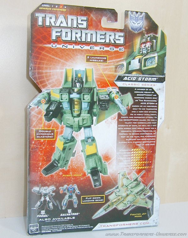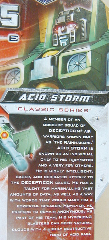 Acid Storm ist ein Mitglied der kaum bekannten Decepticon Luftkrieger-Einheit namens "Die Regenmacher". Als Individuum ist er nur seinen Teammitgliedern und wenigen anderen bekannt. Er ist hochintelligent, eifrig und steht voll hinter der Decepticon Sache. Er hat ein Talent für die Verarbeitung großer Datenmengen und kann sehr gut mit Worten umgehen, was ihn zu einem charismatischen Redner machen würde. Allerdings zieht er es vor anonym und Teil seines Teams zu bleiben. Seine Hyperion-3 Blaster können normale Wolken so umwandeln, dass sie hochdestruktive Säure abregnen.