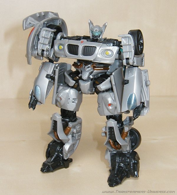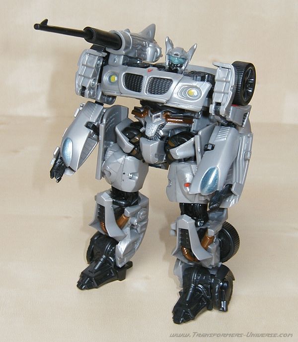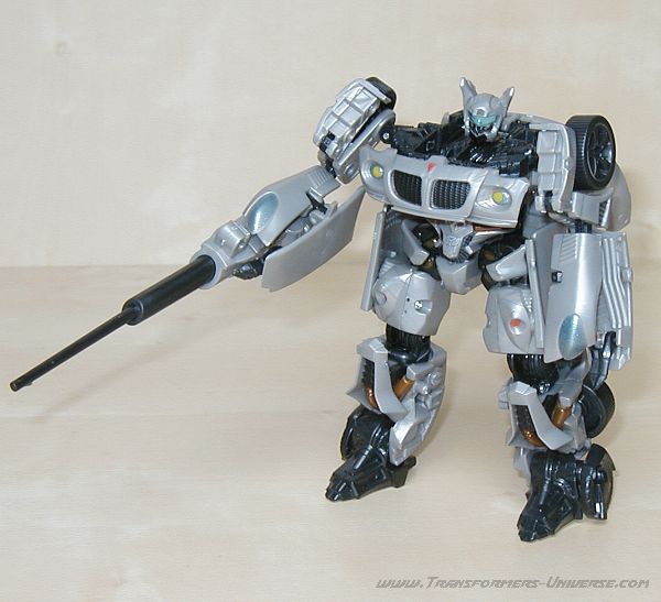 Robotermodus: Jazz schafft den Balanceakt, den selben generellen Look wie die anderen Movie Figuren zu haben, aber trotzdem große Ähnlichkeit mit seinem G1 Vorgänger aufzuweisen. Das selbe Körperdesign, Jazz' bekannten blauen Visor, und der grundsätzliche Look der Figur sind pure Nostalgie für den G1 Fan. Okay, die Farbgebung der Figur könnte etwas spannender sein, aber das stört mich kaum. Was mir allerdings gar nicht gefällt sind Jazz Unterarme. Kurz gesagt, sie sind Schrott. Man nehme die Hälfte der Motorhaube, falte sie nochmal zur Hälfte, und lasse vorne eine winzig kleine Klaue rausgucken. Hätte man sich hier nicht was besseres einfallen lassen können? Und wenn er gezwungen wird, seine Waffe in dieser Hand zu halten... lieber nicht. Gott sei Dank kann man seine Waffe auch auf der Schulter anbringen, das sieht zehnmal besser aus. Alles in allem ein sehr cooler Roboter, aber leider mit echt blöden Armen.