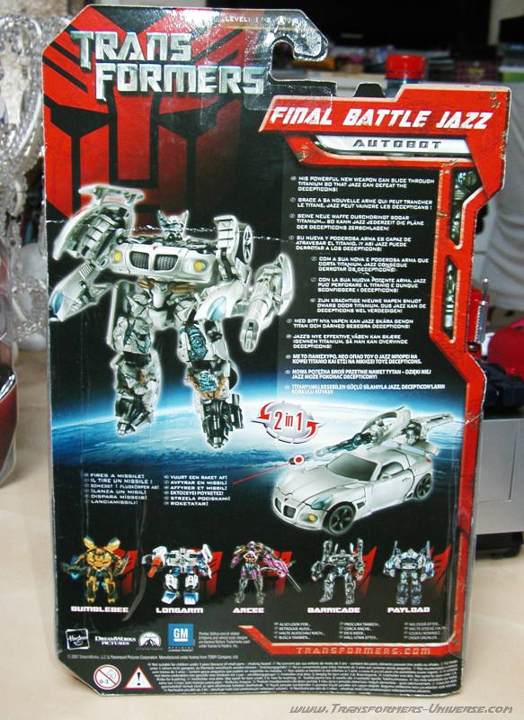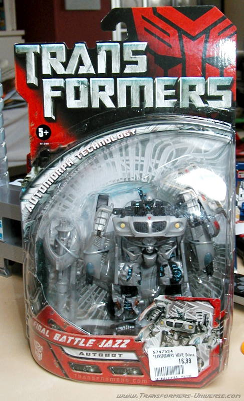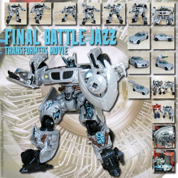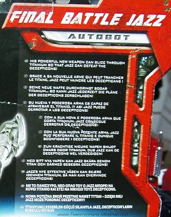 Bemerkungen: Final Battle Jazz ist eine Neuauflage von Deluxe Jazz, das komplette Review findet ihr also dort. Hier nur ein paar Worte zu den Unterschieden. Der offensichtlichste ist natürlich Jazz' riesige neue Waffe. Anders als seine vorherige, recht einfache Auszieh-Waffe, ist das hier eine Art futuristischer, doppelseitiger Mega-Bazooka. Eine Seite klappt zu einem verdammt langen Gewehr auf. Diese Version der Waffe eignet sich am besten für Jazz' Automodus oder als Schulterwaffe im Robotermodus (in beiden Fällen auf dem Heckspoiler angebracht), da sie als Handwaffe für den Roboter einfach zu lang ist, um praktisch zu sein. Dreht man die Waffe um, dann wird sie zu einer Art Maschinengewehr / Minikanone mit einer Art Schutzschild hinter der Mündung. Dies sieht fast genauso aus wie die Waffe, die Jazz kurz mal im Endkampf des Films in der Hand hielt. Die Kanone fungiert nebenbei noch als Raketenwerfer, in den man das beiliegende Projektil laden kann.