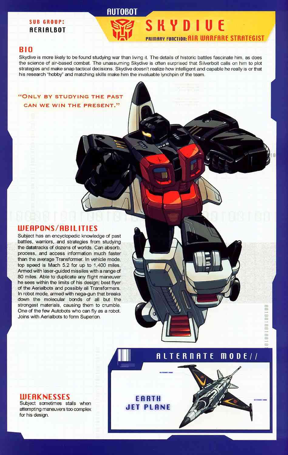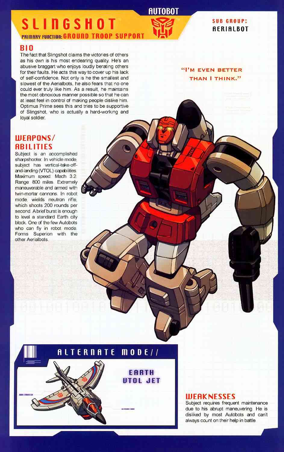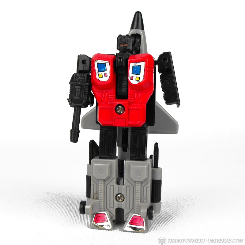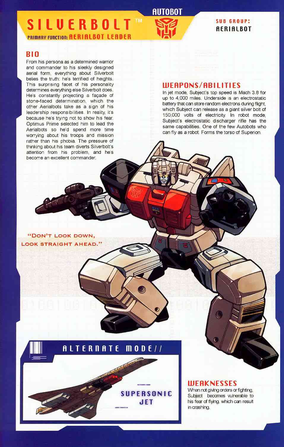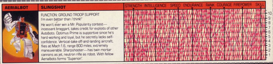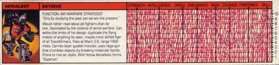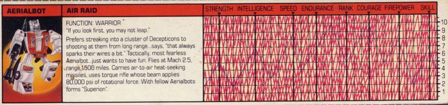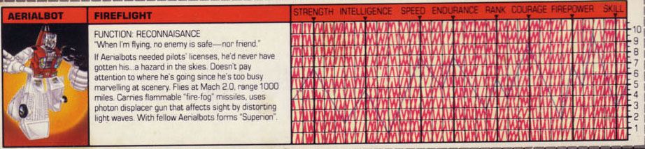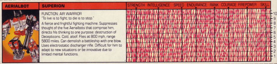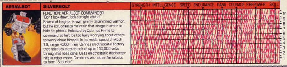 Eine verbissene, furcheinflößende Kampfmaschine. Unterdrückt die Gedanken der fünf Aerialbots, aus denen er bsteht, und konzentriert sein Denken auf einen Zweck: Zerstörung der Decepticons. Kühl und abgehoben. Fliegt mit 800 Meilen pro Stunde, Reichweite 5800 Meilen. Kann mit einem Schlag ein Schlachtschiff zerstrümmern. Nutzt ein Elektrostatisches Gewehr. Hat Probleme sich neuen Situationen anzupassen oder innovative zu sein aufgrund seiner begrenzten mentalen Funktionen.