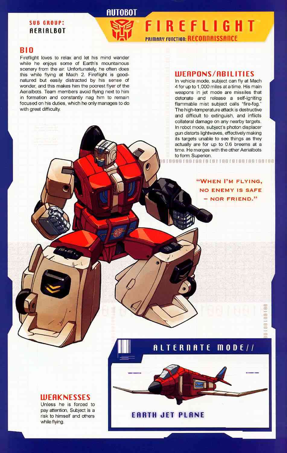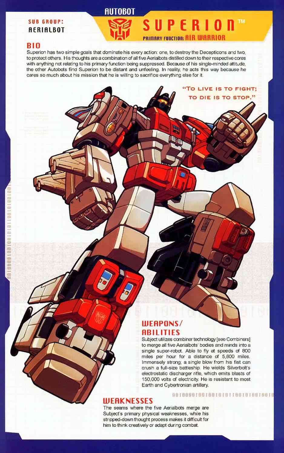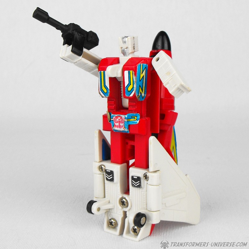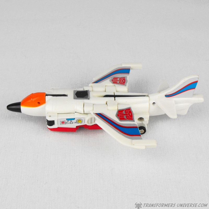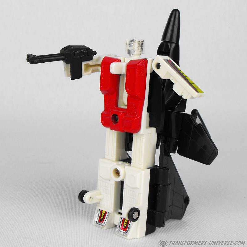 Eine verbissene, furcheinflößende Kampfmaschine. Unterdrückt die Gedanken der fünf Aerialbots, aus denen er bsteht, und konzentriert sein Denken auf einen Zweck: Zerstörung der Decepticons. Kühl und abgehoben. Fliegt mit 800 Meilen pro Stunde, Reichweite 5800 Meilen. Kann mit einem Schlag ein Schlachtschiff zerstrümmern. Nutzt ein Elektrostatisches Gewehr. Hat Probleme sich neuen Situationen anzupassen oder innovative zu sein aufgrund seiner begrenzten mentalen Funktionen.