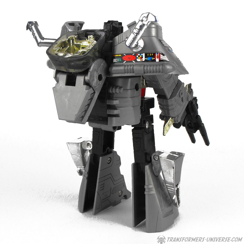 Ein Manko an Grimlocks Design: die Tatsache dass der gesamte Oberkörper seines Alternativmodus an seinem Rücken hängt macht in leider sehr anfällig dafür, nach hinten umzufallen. Ansonsten gibt’s aber nichts Auszusetzen. Grimlock trägt einen doppelläufigen Blaster (plus ein Schwert und ein Raketenwerfer, die mir leider fehlen). Unterm Strich somit: kein perfekter Robotermodus, der aber das Aussehen und den Charme von Grimlock sehr gut einfängt.