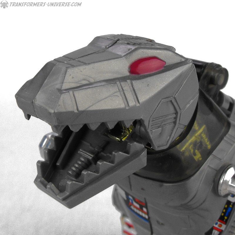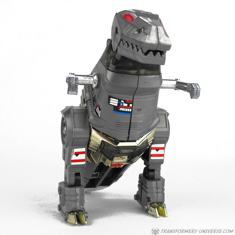 Alternativmodus: Als ob ihr das nicht wüsstet, Grimlock wird zu einem Roboter Tyrannosaurus Rex, oder vielmehr zu dem, wie sich die Menschen in den 80ern einen Tyrannosaurus Rex vorgestellt haben (die Classics Version ist hier etwas realistischer gestaltet, glaube ich). Aber egal, wie kann man einen Roboter T-Rex nicht cool finden? Er hat große Stampf-Beine (sogar mit Kniegelenken), die süßen kleinen Silberärmchen, ein riesiges Maul mit jeder Menge Zähnen, sowie einen großen (unbeweglichen) Schwanz. Ein Überbleibsel seines ursprünglichen Diaclone Designs (siehe unten) ist das Cockpit auf seinem Rücken, dass man öffnen kann, um eine Diaclone Fahrerfigur reinzusetzen.