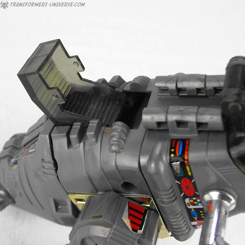Robotermodus: Grimlock ist ein sehr stark aussehender Roboter mit seiner breiten Brust, den mächtigen Armen und Beinen… und einem winzig kleinen Kopf, der sehr, sehr weit hinten sitzt. Aber von dieser seltsamen Kopf-Platzierung mal abgesehen gibt es wenig zu meckern an Grimlocks Aussehen. Er wirkt wie ein mächtiger Krieger, Mission somit erfüllt, und die ‚Flügel‘ auf seinem Rücken unterstreichen das nur noch. Die Figur ist außerdem für ihre Zeit überdurchschnittlich beweglich. Immer noch kein Schlangenmensch, nein, aber Kniegelenke waren 1985 nicht unbedingt weit verbreitet, dafür also Daumen hoch.