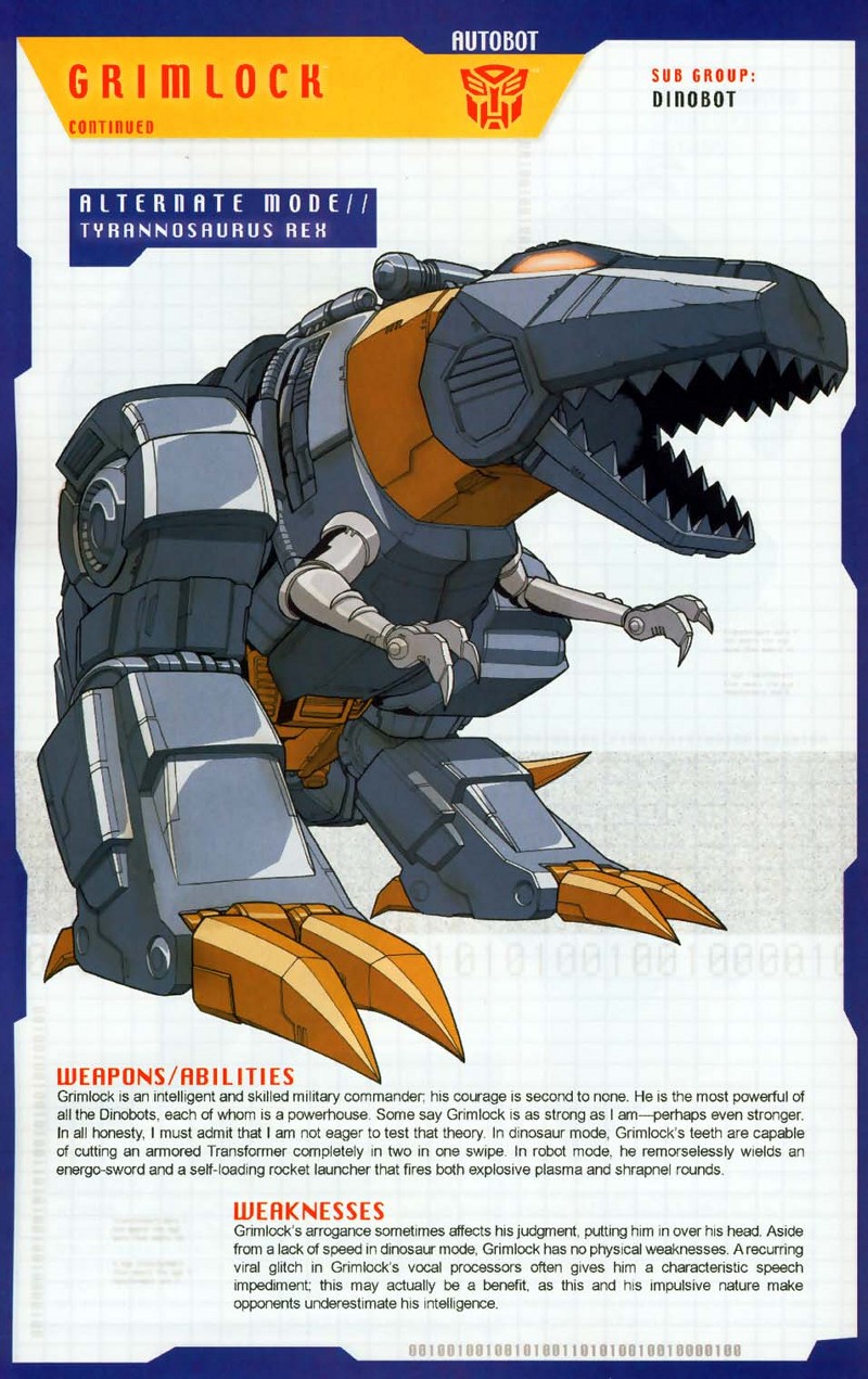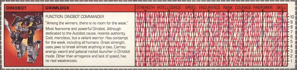 Furchterregendster und stärkster Dinobot. Ist der Autobot Sache treu, aber lässt sich nichts befehlen. Kalt, gnadenlos, aber ein mutiger Krieger. Verachtet die Schwachen, inklusive aller Menschen. Große Kraft, benutzt seine Kiefer um fast alles zu zerbeißen. Trägt ein Energo Schwert und einen Galaxial Raketenwerfer im Dinobot Modus. Keine Schwächen außer seiner Arroganz und Langsamkeit.