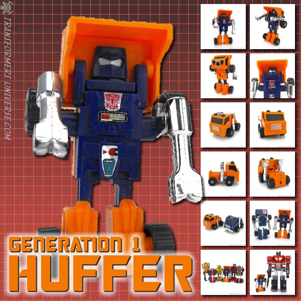 Bemerkungen: Huffer ist Teil der ursprünglichen Autobot Crew aus der ersten Staffel und spielte in vielen Episoden aus Staffel 1 und 2 mit. Die meiste Zeit gab er Sätze wie "Wir sind verloren" von sich, aber er konnte zeitweise auch optimistisch sein und führte die Autobots sogar einmal in die Schlacht, als Optimus Prime in der Episode "Divide and Conquer" außer Gefecht war. Huffer wurde nachträglich der Liste der Opfer des Transformers Kinofilms (1986) hinzugefügt, als Daniel in der Episode "Dark Awakening" an seinem Grab vorbei ging.
