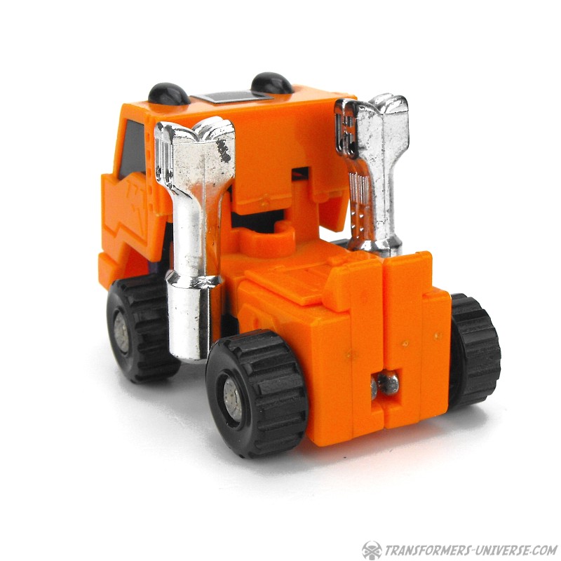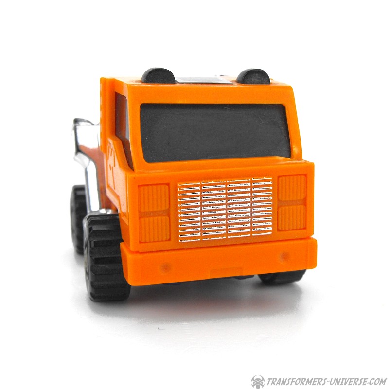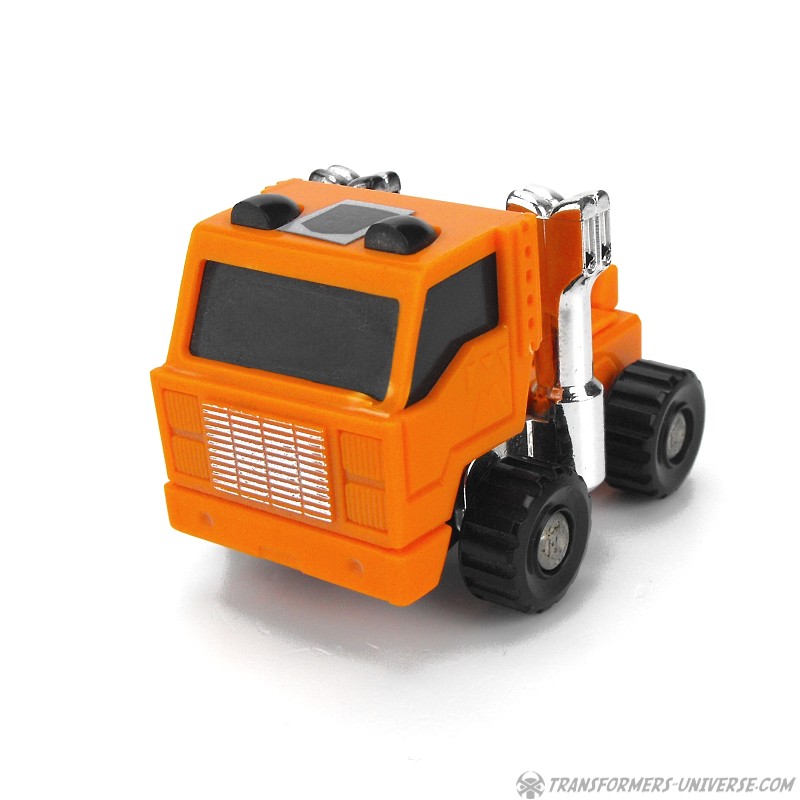 Alternativmodus: Um Huffer in den Fahrzeugmodus zu bringen bedarf es einer einfachen, aber angesichts seiner Größe überraschend komplexen Transformation. Er beschränkt sich nicht auf die normale leg-dich-auf-den-Bauch-und-klapp-die-Beine-ein Verwandlung, bei ihm gehört ein wenig mehr dazu. Das Resultat ist ein ziemlich anständiger Mini-Truck, der für seine Größe eine große Menge an Details bietet. Huffer kann zwar nicht Optimus Primes Anhänger ziehen, wie er es in einer der ersten Cartoon Episoden gemacht hat, dazu ist er dann doch zu klein, aber er ist ein netter kleiner Truck. Keine Beschwerden.