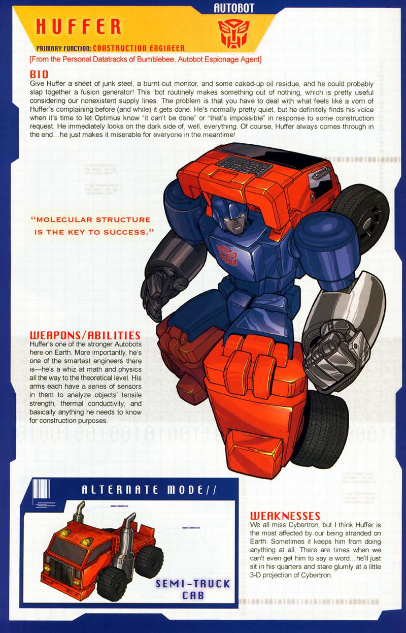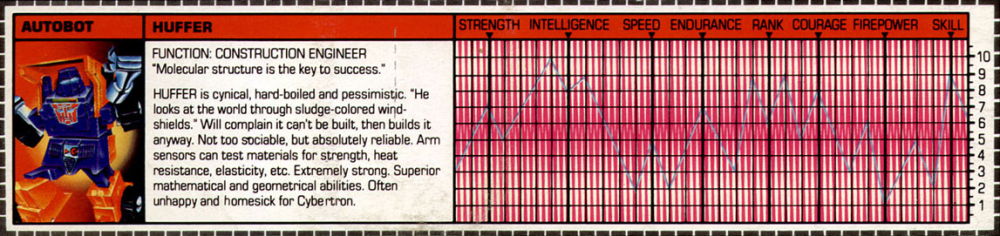 Huffer ist ein abgebrühter Zyniker und Pessimist. "Er sieht die Welt durch schlammverdreckte Windschutzscheiben." Sagt immer, das etwas nicht gebaut werden kann, baut es dann aber trotzdem. Kein sozialer Typ, aber absolut zuverlässig. Seine Armsensoren können Materialen auf Stärke, Hitzebeständigkeit, Elastizität, etc. prüfen. Extrem stark. Überlegene mathematische und geometrische Fähigkeiten. Oft unglücklich, hat Heimweh nach Cybertron.