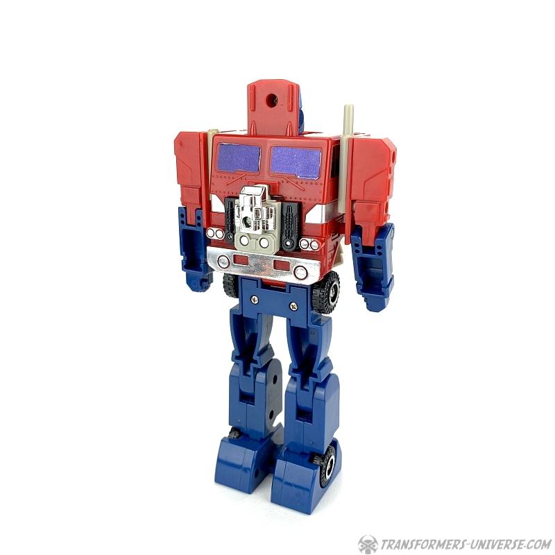 Roboter Modus: Optimus Primes kleinerer Robotermodus ist eine schnittigere (und weniger bewegliche) Version des 1984er Originals. Die LKW-Front auf seiner Brust ist getürkt, die richtige ist auf seinem Rücken, wo auch seine Powermaster Figur als Motor andockt.
