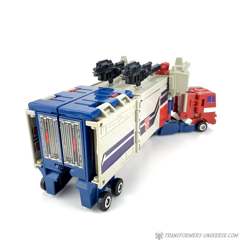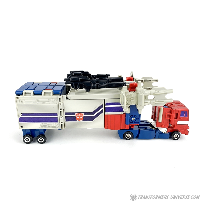 Fahrzeug Modus: Optimus Prime verwandelt sich wenig überraschend in einen roten LKW mit Anhänger. Anders als die 1984er Version kann der Anhänger mit Primes Kanonen bestückt werden, was ihm Feuerkraft in mehrere Richtungen gibt.