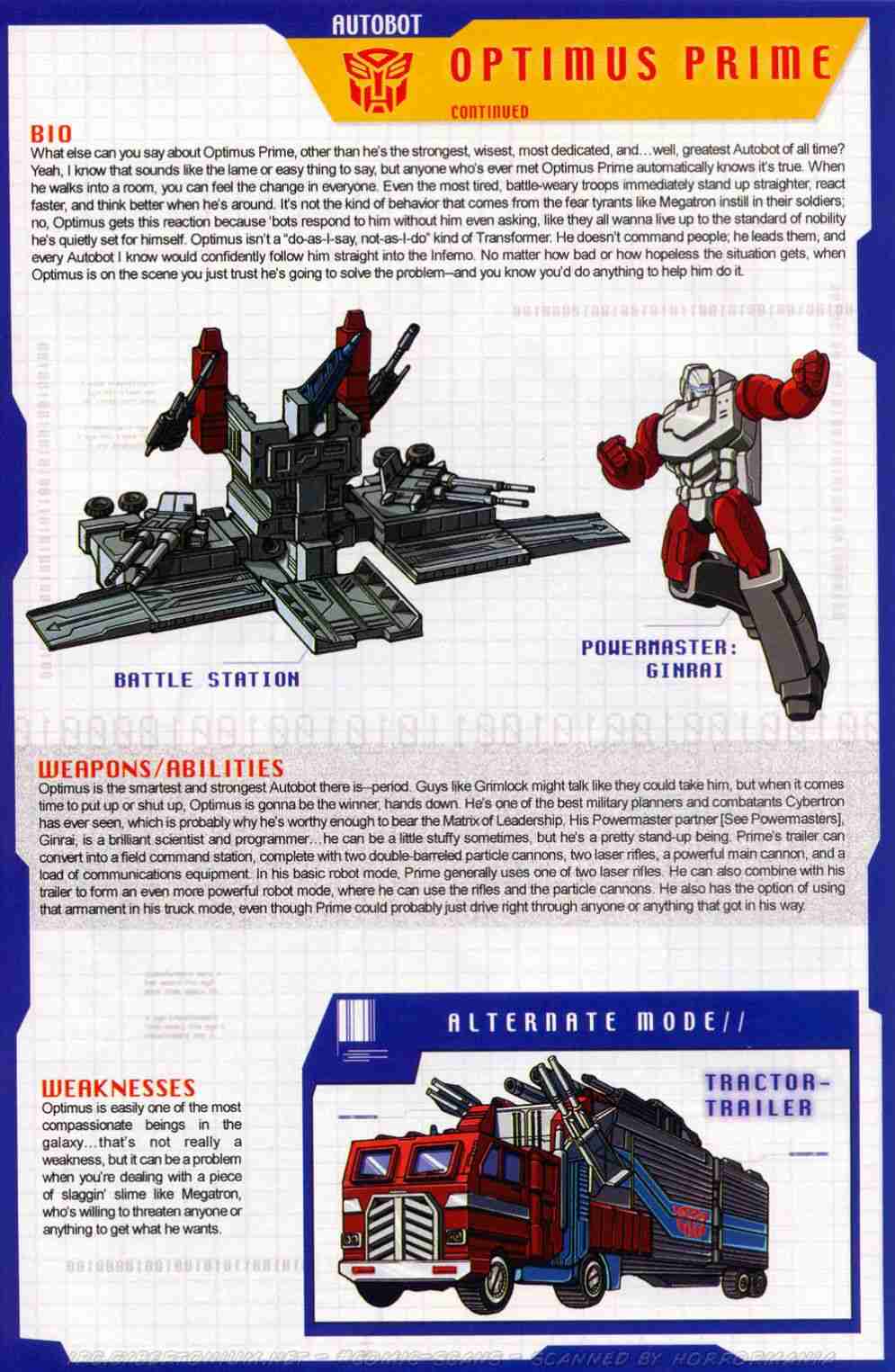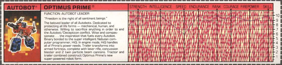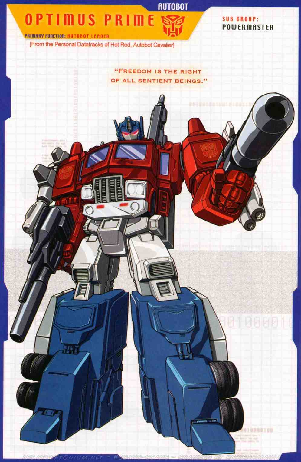 Der geliebte Anführer aller Autobots. Entschlossen alle Lebensformen zu schützen - Mechanische, Menschen und andere. Würde alles opfern um den Autobot/Deception Konflikt zu beenden. Weise und mitfühlend ist er die Inspiration für alle Autobots. Ist binärverbunden mit dem super-intelligenten Nebulanischen Computerprogrammierer Hi-Q. Im Motormodus versorgt Hi-Q Prime mit aller Energie, die er braucht. Der Anhänger verwandelt sich eine bewaffnete Festung mit Laserkanonen, Druckwellenblaster und zwei Partikelstrahlenkanonen. Zugmaschine und Anhänger verbinden sich zu Optimus Primes neuem, superstarken Robotermodus.