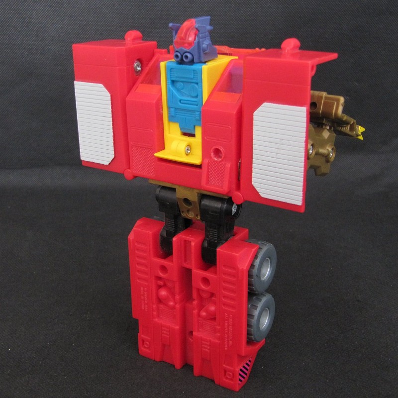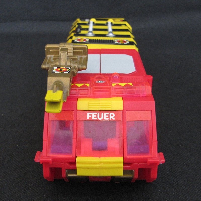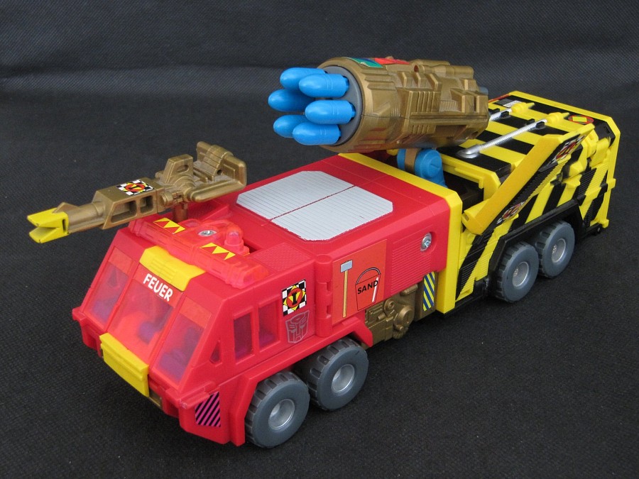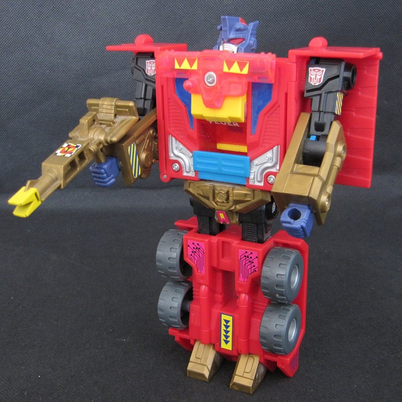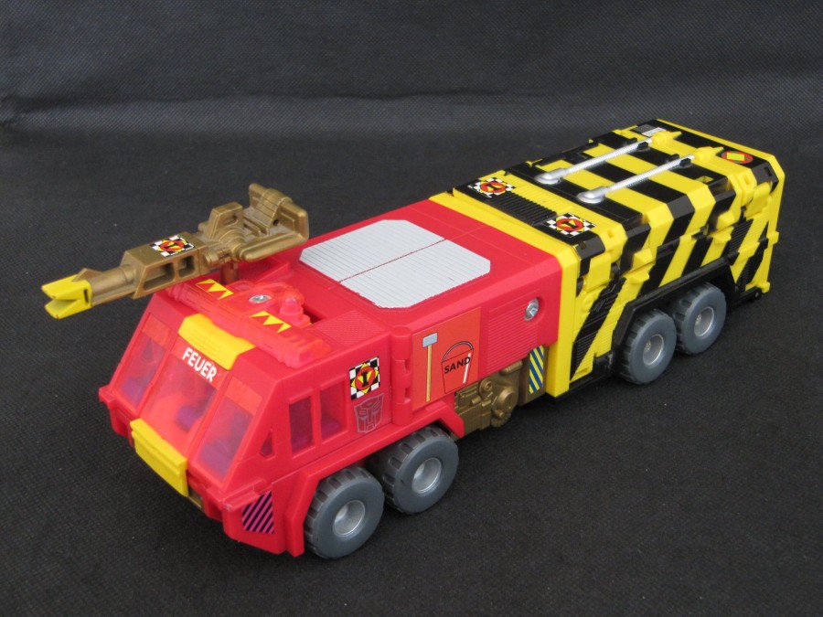 Bemerkungen: Pyro, auch unter dem Namen Spark erschienen, war eine der finalen Figuren der sogenannten "Euro-G1" Reihe, auch manchmal G1.5 genannt, also von den Figuren, die nur in Europa in den Jahren 1991 bis 1993 erschienen. Da wir uns bereits im Übergang zur Generation 2 befanden, trägt Pyro bereits ein G2 Autobot Symbol, aber den Schriftzug "Generation 2" sucht man vergeblich auf der Packung. Die Figur ist berüchtigt für ihre Probleme mit dem sogenannten Goldplastiksyndrom, da mehrere Teile der Figur komplett aus Goldplastik und damit extrem zerbrechlich sind.