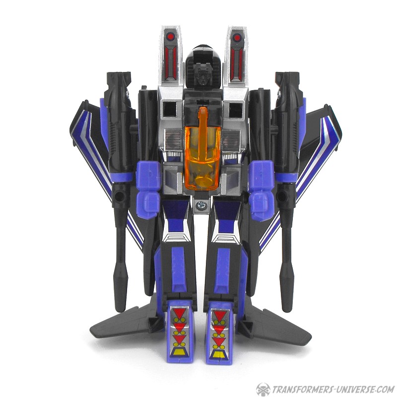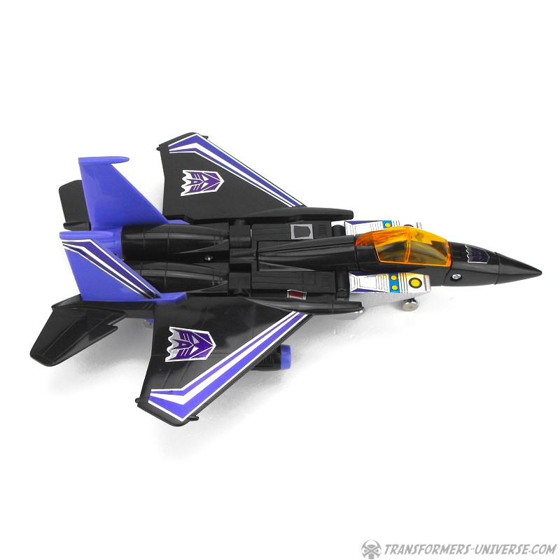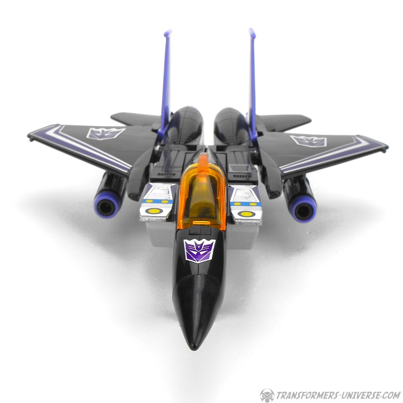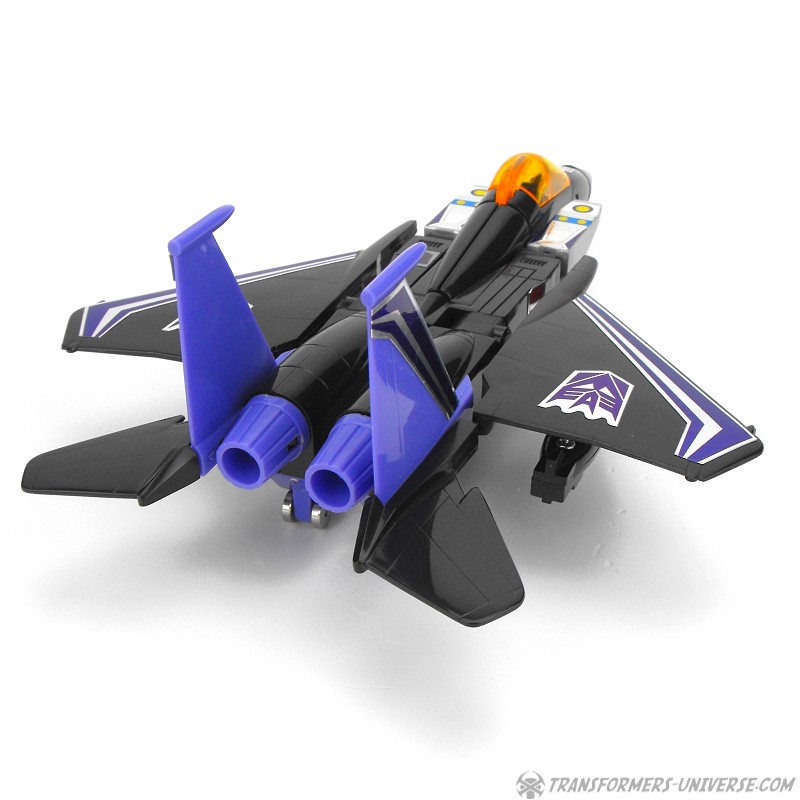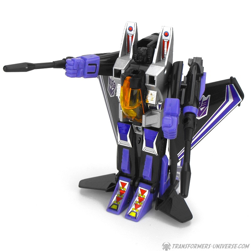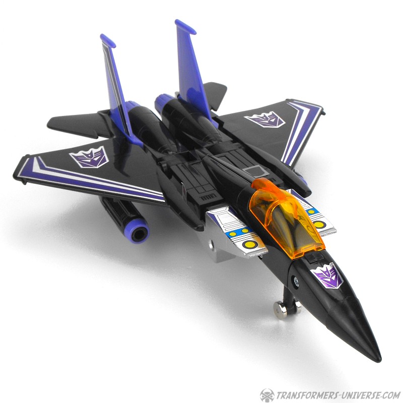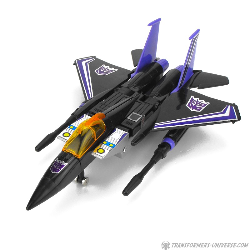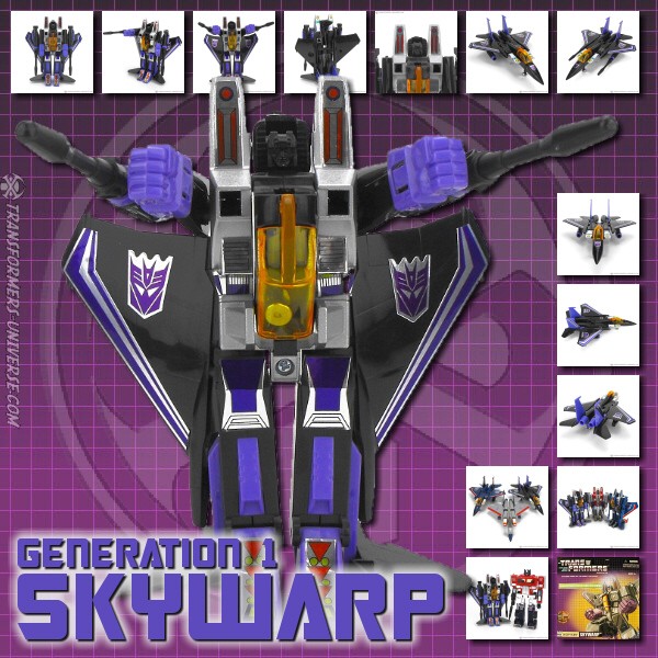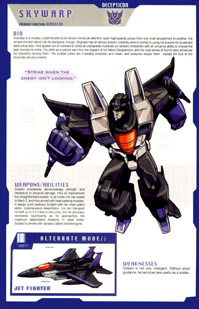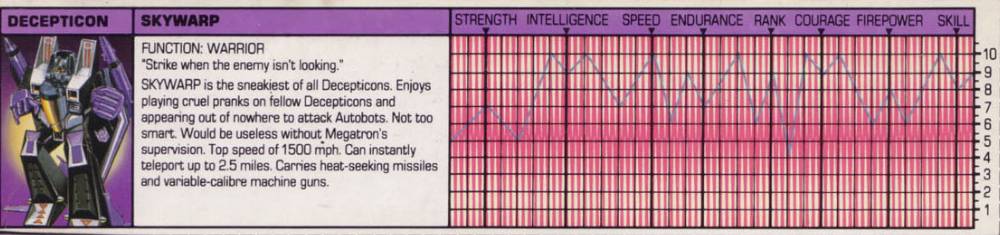 Skywarp ist der heimtükischste aller Decepticons. Er genießt es seinen Decepticon Kameraden grausame Streiche zu spielen und aus dem Nichts erscheinend Autobots anzugreifen. Ist nicht sehr schlau und wäre ohne Megatrons Aufsicht nutzlos. Höchstgeschwindigkeit ist 1500 Meilen pro Stunde. Kann ohne Verzögerung bis zu 2,5 Meilen weit teleportieren. Trägt hitzesuchende Raketen und Maschinengewehre mit variablem Kaliber.