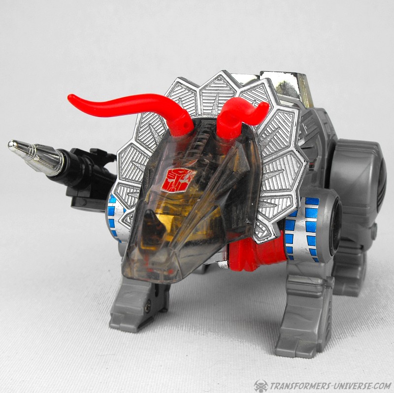Alternativmodus: Slag verwandelt sich in einen Roboter-Triceratops (das ist griechisch und heißt übersetzt „Drei-Horn-Gesicht“), eine der jüngsten Dinosaurierspezies, die vor etwa 68 bis 66 Millionen Jahren die Erde bewohnten. Ich kann jetzt nicht wirklich beurteilen wir vorbildgetreu diese Roboterversion ist, aber für mich sieht sie toll aus. Groß, kräftig, stämmig. Alle vier Beine sind beweglich, zumindest ein wenig, und man kann das Maul öffnen (aber nicht zu weit, sonst sieht man das Robotergesicht). Außerdem hat Slag einen Raketenwerfer für den Dinomodus dabei, den man an der rechten vorderen Schulter befestigen kann (an der linken geht auch, allerdings dann halt kopfüber). Unterm Strich somit für mich der bessere von Slags zwei Modis. Cool aussehend, ganzheitlich, keine Beschwerden.