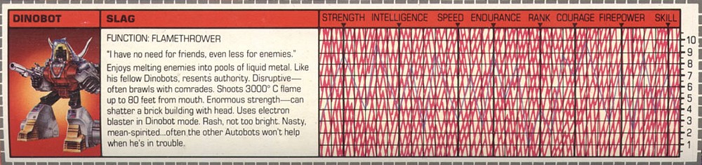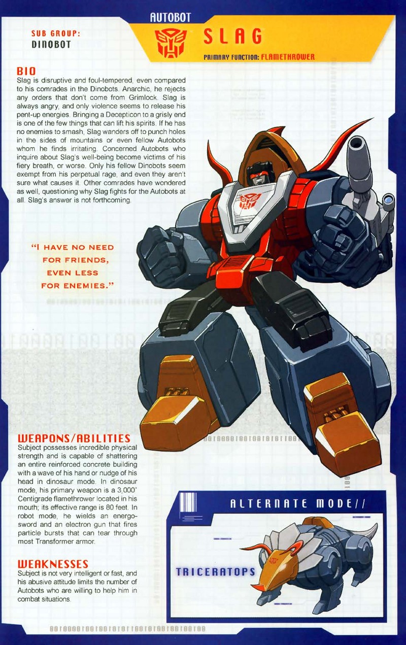 Slag ist unglaublich stark, immer ein Störfaktor, und einfach nur gemein. Oft prügelt er sich mit seinen Kameraden, weswegen sie ihm selten helfen, wenn er in Schwierigkeiten ist. Trotz seiner gemeinen Persönlichkeit teilt er ihre Abneigung gegen Autorität. Er kann 3000 Grad heiße Flammen aus seinem Maul bis zu 30 Meter weit speien und genießt es, seine Feinde zu Metallpfützen zu schmelzen. Er ist nicht sonderlich schlau und zertrümmert gerne Mauern mit seinem Kopf. Außerdem nutzt er einen Elektronenblaster im Dinobot Modus.