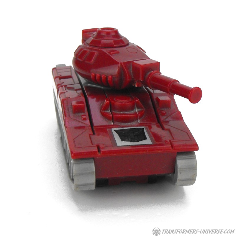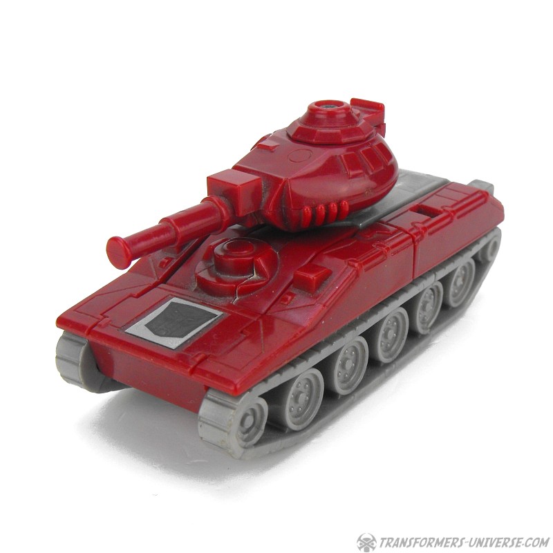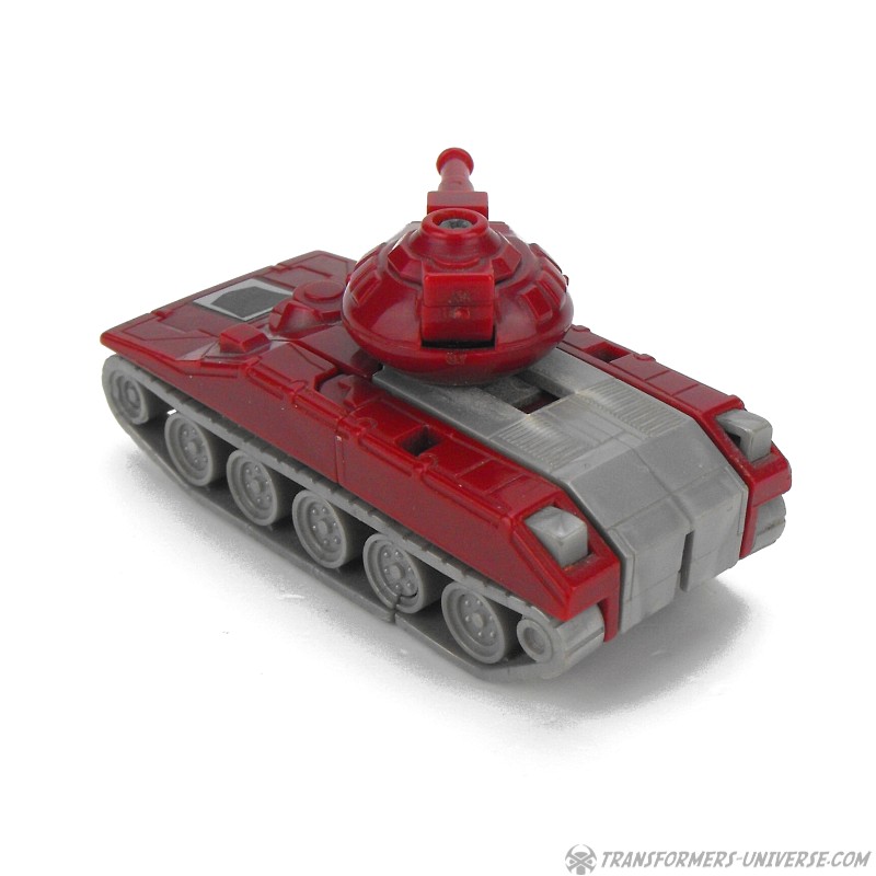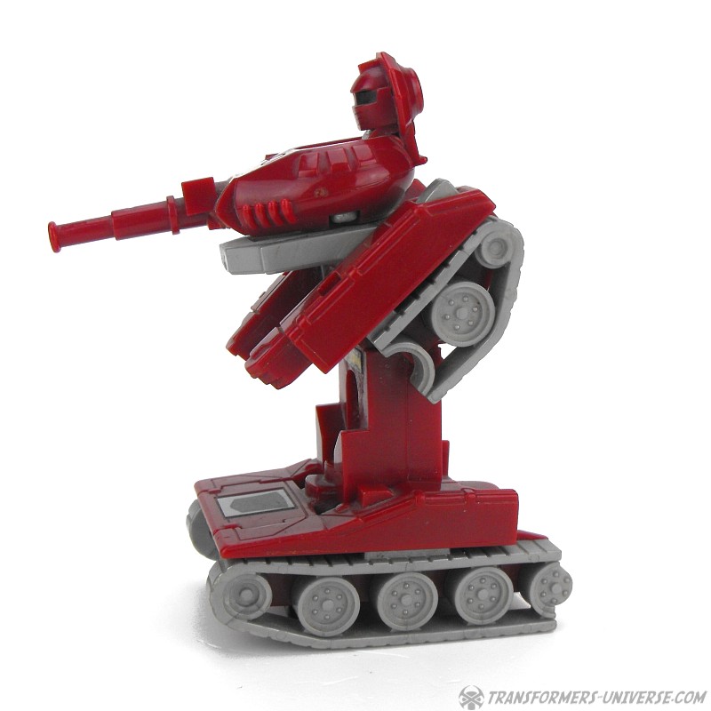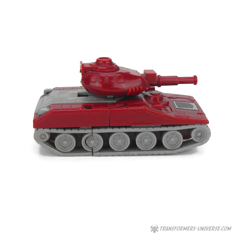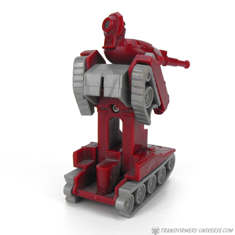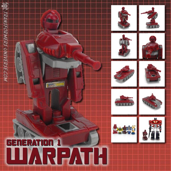 Robotermodus: Warpath gehört zu den kleinsten unter den Transformers (darunter sind nur noch Minicons und Micromasters) und reicht einem normalgroßen Transformer kaum bis zur Hüfte. Sein Robotermodus sieht ein wenig erzwungen aus und es gibt keinen Zweifel daran, in was er sich verwandelt. Er kann seine Arme an den Schultern drehen und den Kopf (zusammen mit dem Geschützturm) drehen und das war's. Er hat keine echten Beine oder Füße, nur den vorderen Teil der Panzerketten. Obwohl er ein lustiger kleiner Kerl ist, bietet er leider nicht wirklich viel Spielspaß.