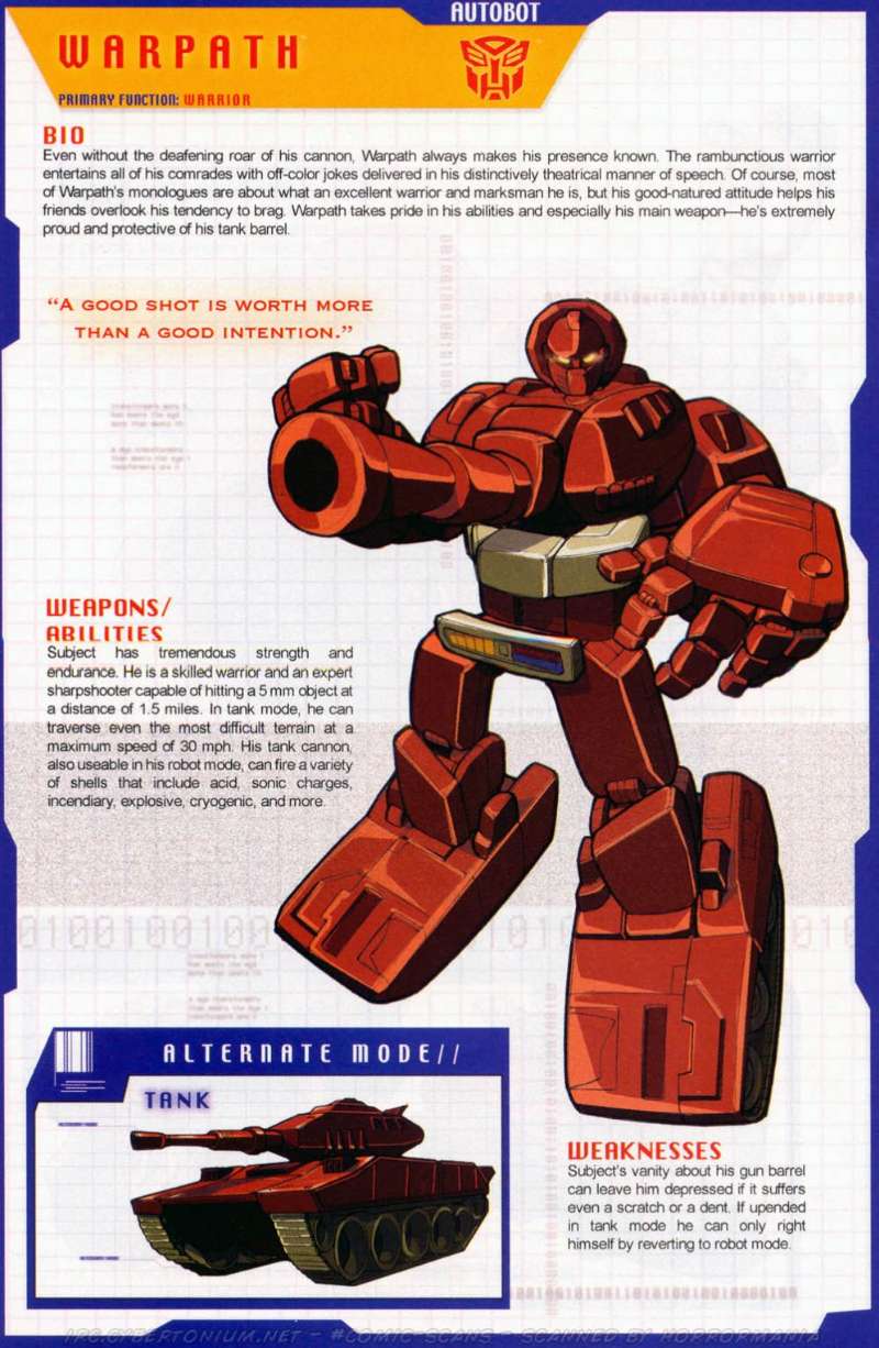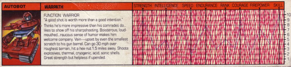 Bemerkungen: Ich hab' diese Figur nicht wegen ihres Spielspaßes gekauft, denn davon hat er nicht viel. Warpath war jedoch einer der lustigeren Cartoon Charaktere. Nicht nur, dass er sich als einer von nur wenigen Autobts in ein nicht-ziviles Fahrzeug verwandelt, er war auch als Typ sehr lustig. Er sorgte stets für seine eigenen Soundeffekte und das neben seinen tatsächlichen Schüssen, sogar abseits des Schlachtfelds. Ein lustiger Typ durch und durch, deshalb hab' ich ihn mir geholt (und außerdem war er billig).