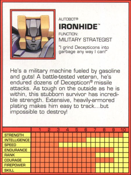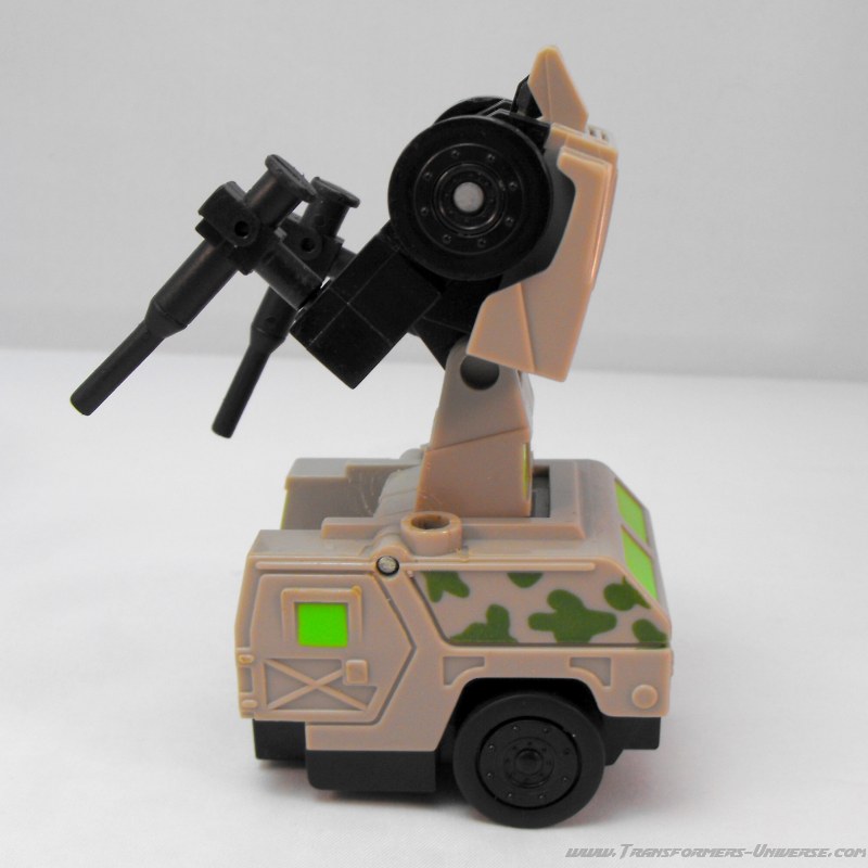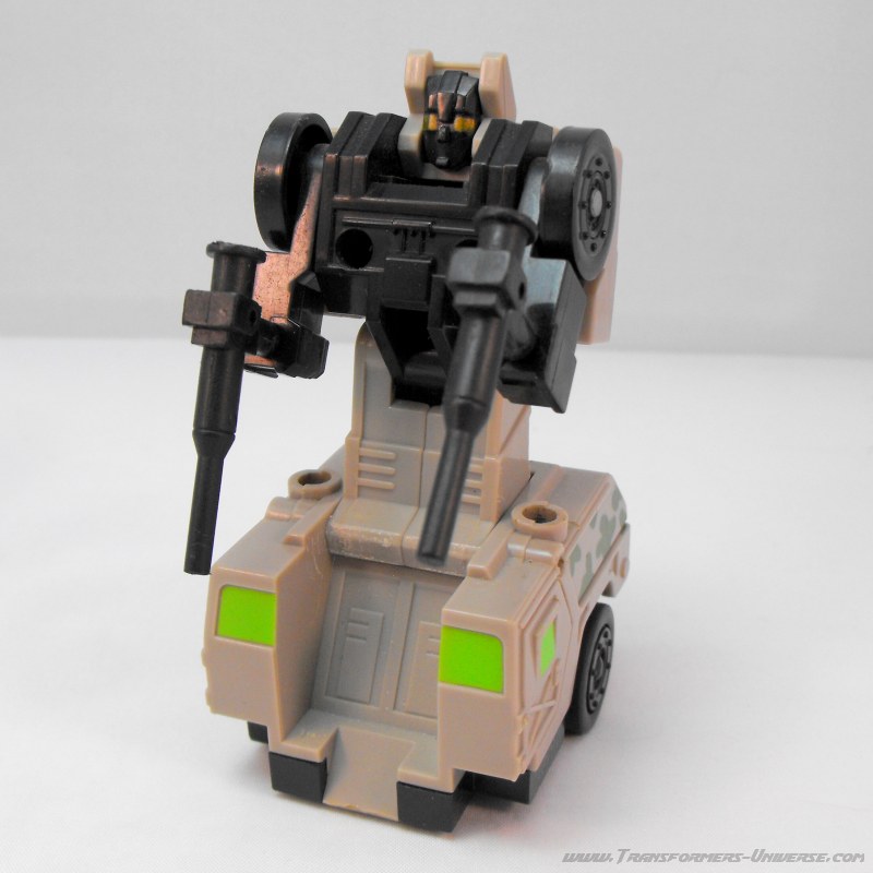 Er ist eine Militärmaschine, angetrieben von Benzin und Mut! Ein kampferprobter Veteran, der bereits Dutzende Raketenangriffe der Decepticons überstanden hat. Sein Äußeres ist so hart wie sein Kern. Dieser hartnäckige Überlebenskünstler hat unglaubliche Kraft. Seine schwer gepanzerte Außenhaut macht es leicht ihn zu finden... aber unmöglich ihn zu zerstören!