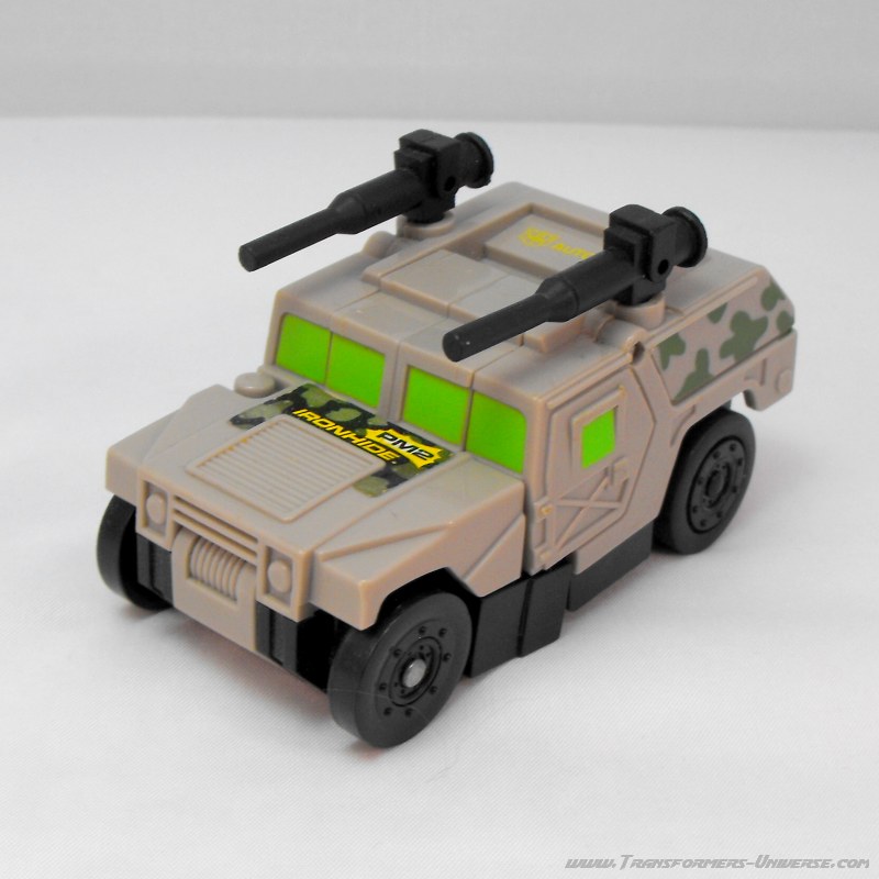 Robotermodus: Erstens, dieser Roboter hier (wenn man ihn so nennen kann) hat keinerlei Ähnlichkeit mit G1 Ironhide, weder der Spielzeugfigur noch dem Cartoon Charakter. Zweitens, man kann das Ding hier eigentlich nur mit einem zugekniffenen Auge als Roboter bezeichnen. Eigentlich ist es immer noch ein Auto, wo die vordere Hälfte hochklappt um den Oberkörper eines Roboters zu offenbaren. Erinnert irgendwie an die Bumper Battlers aus Animated. Ironhide kann die Arme an den Schultern nach vorne drehen und seine beiden Waffen halten... das war’s. Sein „Powermaster“ Gimmick (siehe unten) ist auch in diesem Modus verwendbar. Unterm Strich also... nun ja, kein so toller Robotermodus.