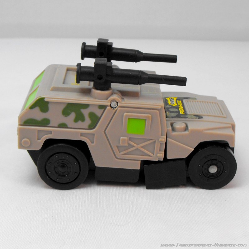 Alternativmodus: Ironhide transformiert (ansatzweise) in ein Hummer-ähnliches Fahrzeug mit recht spärlich aufgetragenem Tarnmuster und seinem Namen auf der Motorhaube (recht üblich in G2). Seine beiden Waffen lassen sich oben einstöpseln, was zum „Powermaster“ Gimmick gehört. Die „Power“ kommt hier einzig und allein aus dem Aufziehmotor. Stöpselt man die Waffen ein, dann wird der Mechanismus gelöst und das Auto schnellt vor. Spaß für ein kleines Kind, aber kaum mehr als das. Unterm Strich also: ein akzeptabler, um ein Gimmick herum gebauter Fahrzeugmodus. Nicht mehr als das.