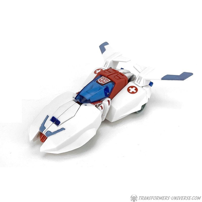 Alternativmodus: Natürlich verwandelt sich Minerva in das gleiche futuristische Flügelauto wie ihre Schwestern. Das eigentliche Auto sieht jetzt außer bei den Farben nicht anders aus, aber es gibt etwas, worauf man bei der Transformation achten muss. Bei Arcee und Dragstrip war es grundsätzlich egal, wie man ihren Roboterkopf im Automodus positioniert. Dank ihren Antennen jedoch muss man bei Minerva den Kopf genau so drehen, dass die Spitzen der Antennen hinter dem Cockpit rausragen, sonst passt es nicht. Hier bitte Vorsicht walten lassen, die Antennen sind recht dünn und man will sie ja nicht bei der Verwandlung abbrechen.