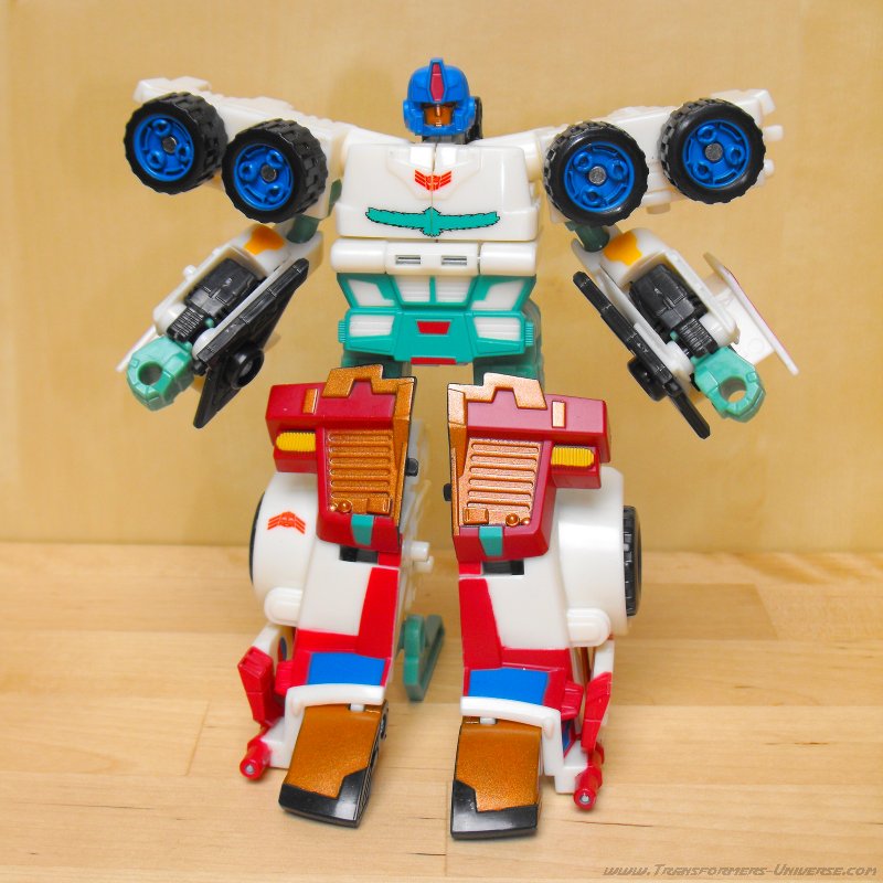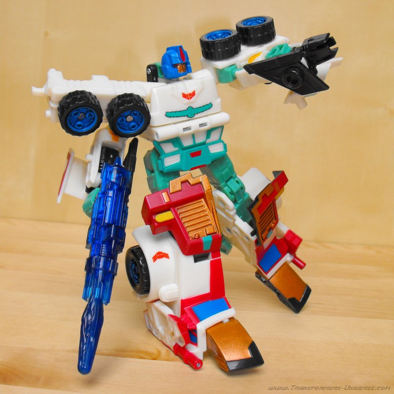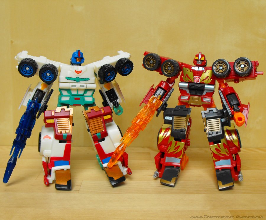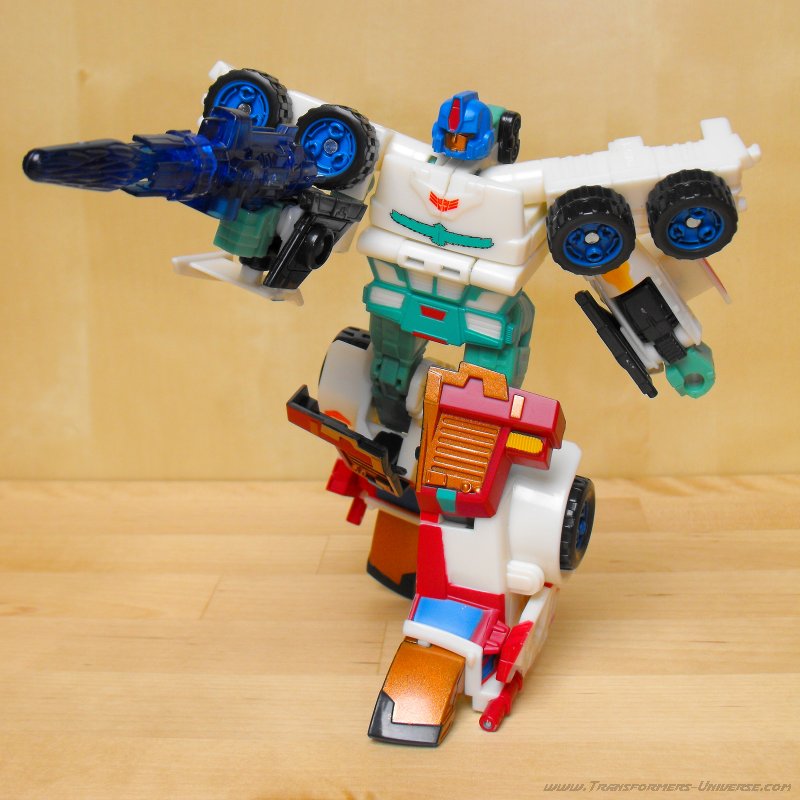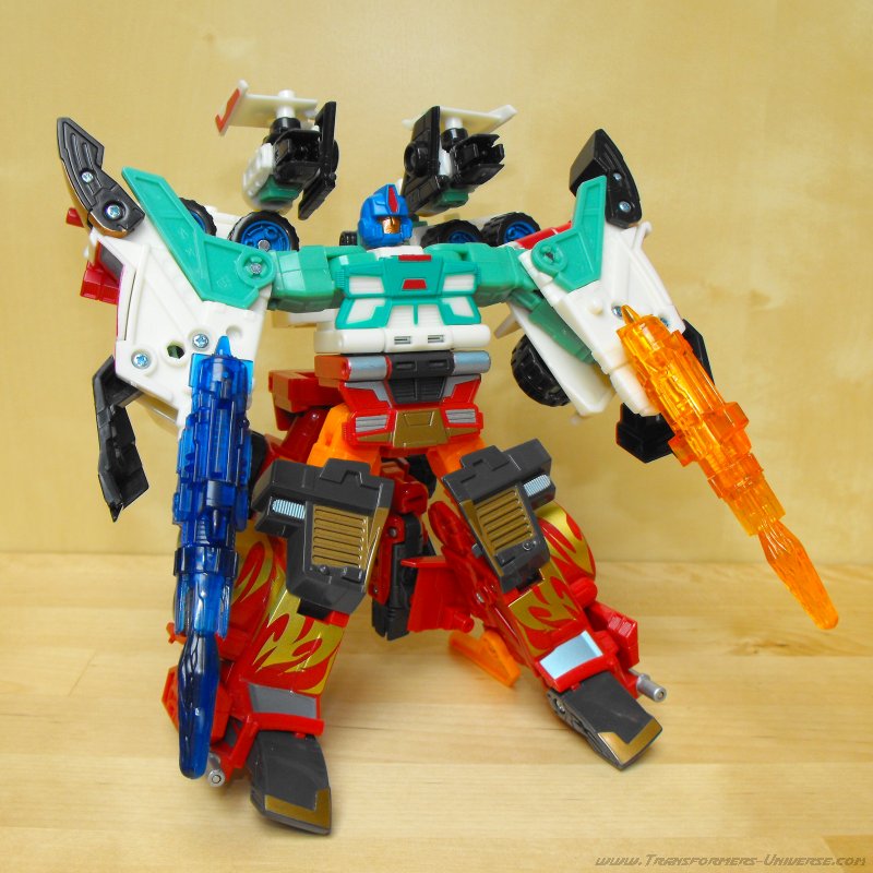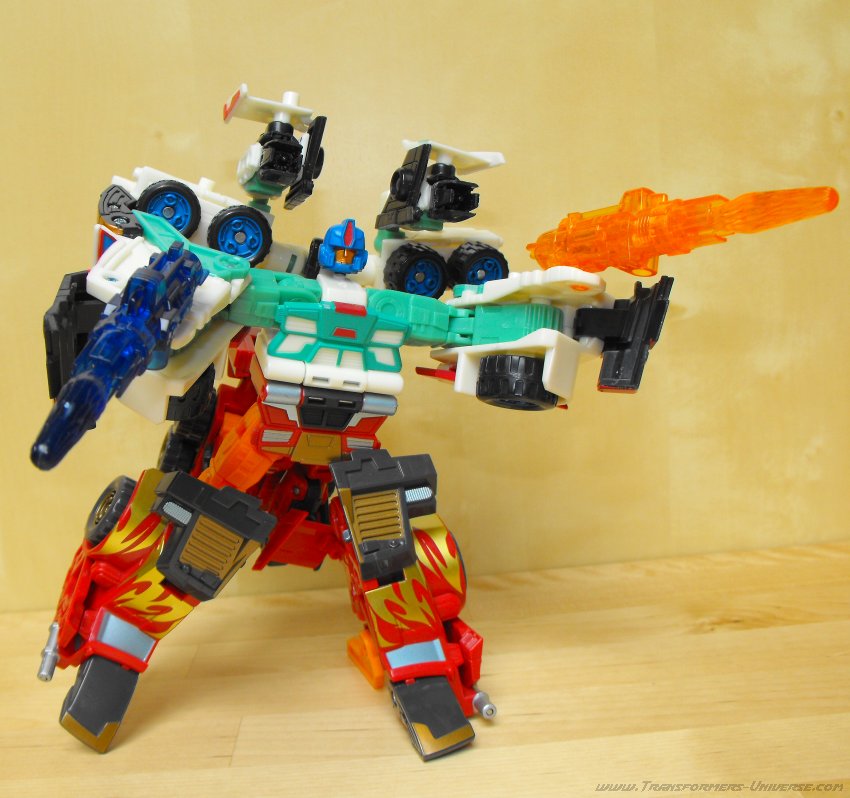 Ich hatte irgendwie schon immer eine Schwäche für G1 Thunderclash, keine Ahnung wieso. Über die Wahl von Energon Rodimus als Basis bin ich nicht so hundertprozentig glücklich. Beide werden zu Trucks, ja, aber da enden ihre Gemeinsamkeiten auch schon. Und obwohl Energon Rodimus natürlich deutlich beweglicher als G1 Thunderclash ist (was auch nicht schwer ist), so ist er doch im Vergleich mit den anderen Figuren des Wings of Honor Sets eher eingeschränkt. Trotzdem, eine nette Figur, aber für mich die schwächste aus dem 5er Set.