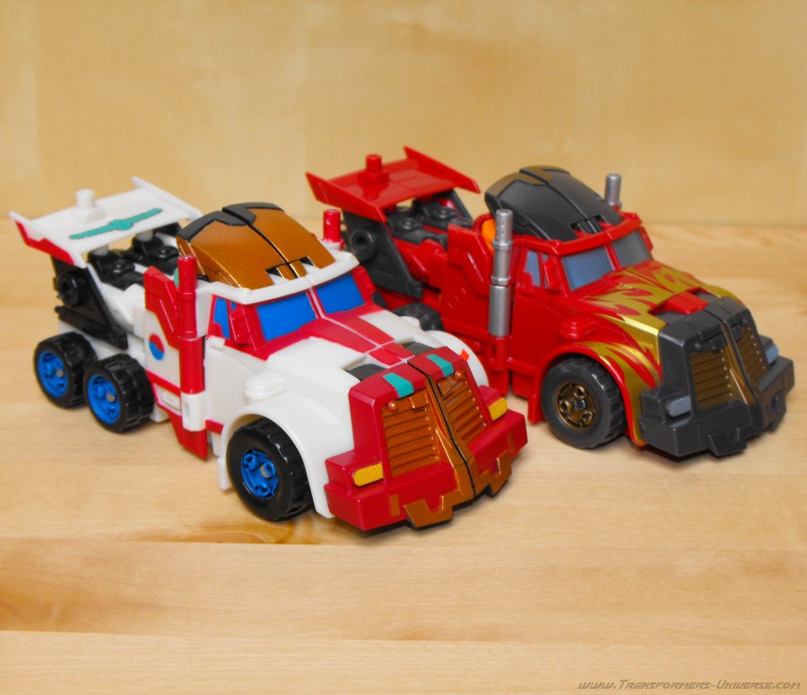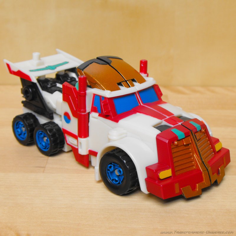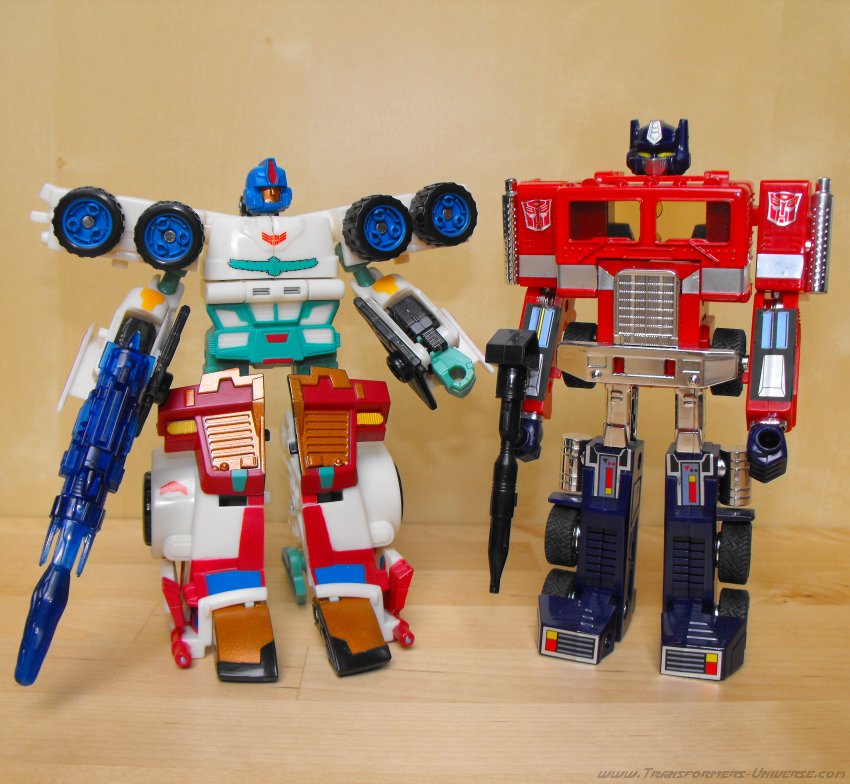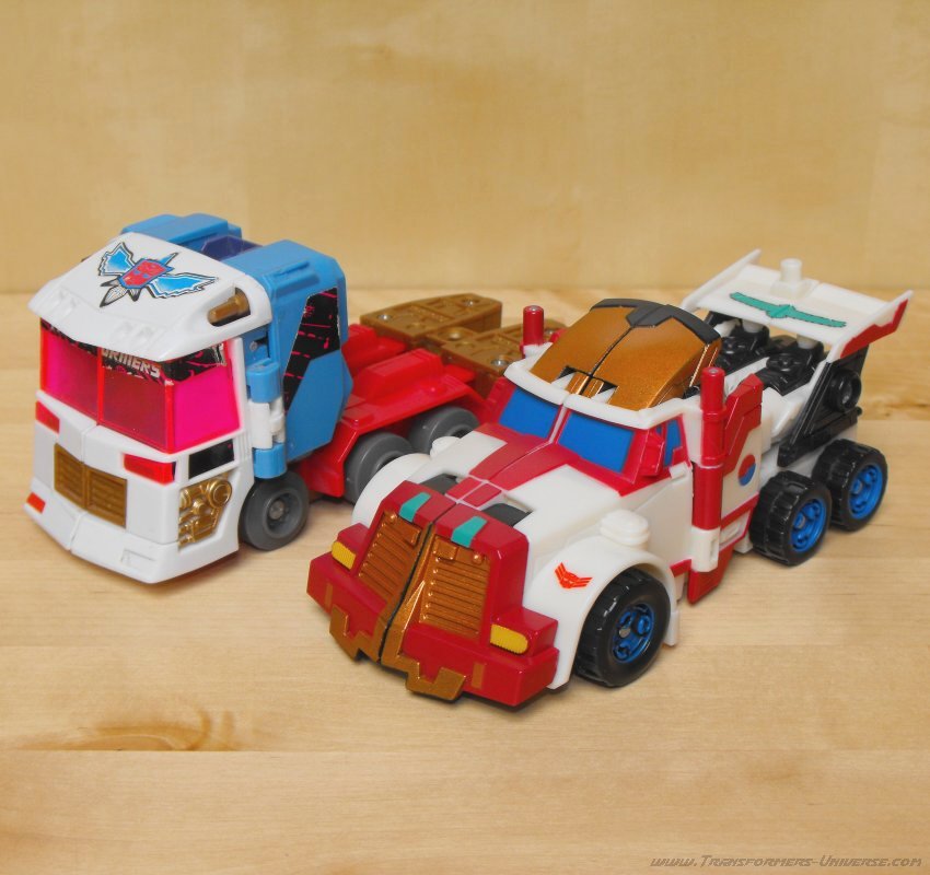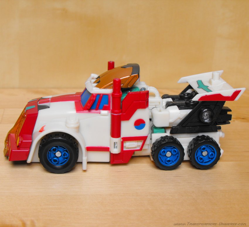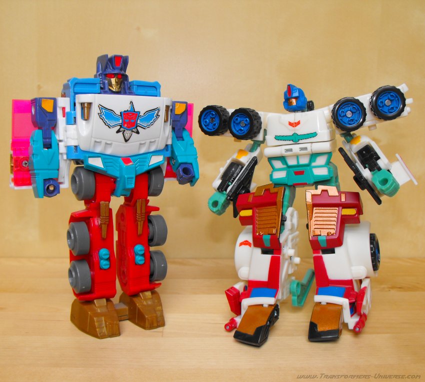 Ich hatte irgendwie schon immer eine Schwäche für G1 Thunderclash, keine Ahnung wieso. Über die Wahl von Energon Rodimus als Basis bin ich nicht so hundertprozentig glücklich. Beide werden zu Trucks, ja, aber da enden ihre Gemeinsamkeiten auch schon. Und obwohl Energon Rodimus natürlich deutlich beweglicher als G1 Thunderclash ist (was auch nicht schwer ist), so ist er doch im Vergleich mit den anderen Figuren des Wings of Honor Sets eher eingeschränkt. Trotzdem, eine nette Figur, aber für mich die schwächste aus dem 5er Set.