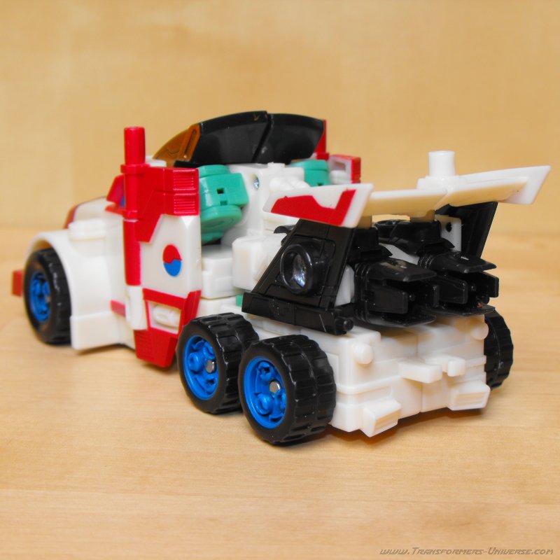 Alternativmodus: Thunderclash verwandelt sich in einen langnasigen Renntruck mit Nachbrenner-Raketen hinten drauf. Viel Ähnlichkeit mit dem Truckmodus von G1 Thunderclash hat er hier nicht. Die beiden sehen ein wenig zu unterschiedlich aus (auch dank ganz anderer Transformation), als dass sie hier farb- oder design-mäßig ähnlich sein könnten. Aber als Truck mach Thunderclash trotzdem einiges her. Sowohl Farben als auch Details sind gut. Thunderclashs Waffe kann hinten drauf montiert werden und dort in so ziemlich alle Richtungen außer geradeaus feuern. Alles in allem also ein ziemlich anständiger Fahrzeugmodus. Nichts zu meckern.