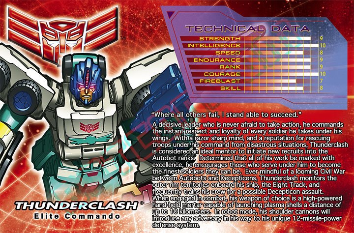Ein entscheidungsfreudiger Anführer, der nicht vor Taten zurückschreckt und den sofortigen Respekt und die Loyalität jedes Soldaten unter seinem Kommando genießt. Mit seinem scharfen Verstand und einem Ruf, seine Truppen auch aus den schwierigsten Situationen heil rauszubringen, gilt Thunderclash als der ideale Mentor für neue Rekruten in den Rängen der Autobots. Entschlossen, dass jede Arbeit exzellent durchgeführt wird, ermutigt er jeden seiner Untergebenen, zum bestmöglichen Soldaten zu werden. Der drohende Bürgerkrieg zwischen Autobots und Decepticons ist ihm stets bewußt und er bewacht die Außenterritorien mit seinem Schiff, der Eight Track, und trainiert mit seiner Crew für mögliche Decepticon Angriffe. Im Kampf ist seine Lieblingswaffe ein mächtiger Mörser, der Plasma-Projektile bis zu 10 Kilometer weit feuern kann. Im Robotermodus konfrontieren seine Schulterkanonen jeden Feind mit nicht weniger als 12 Raketen.