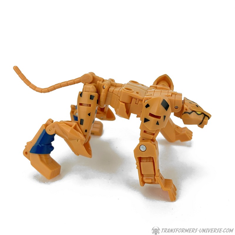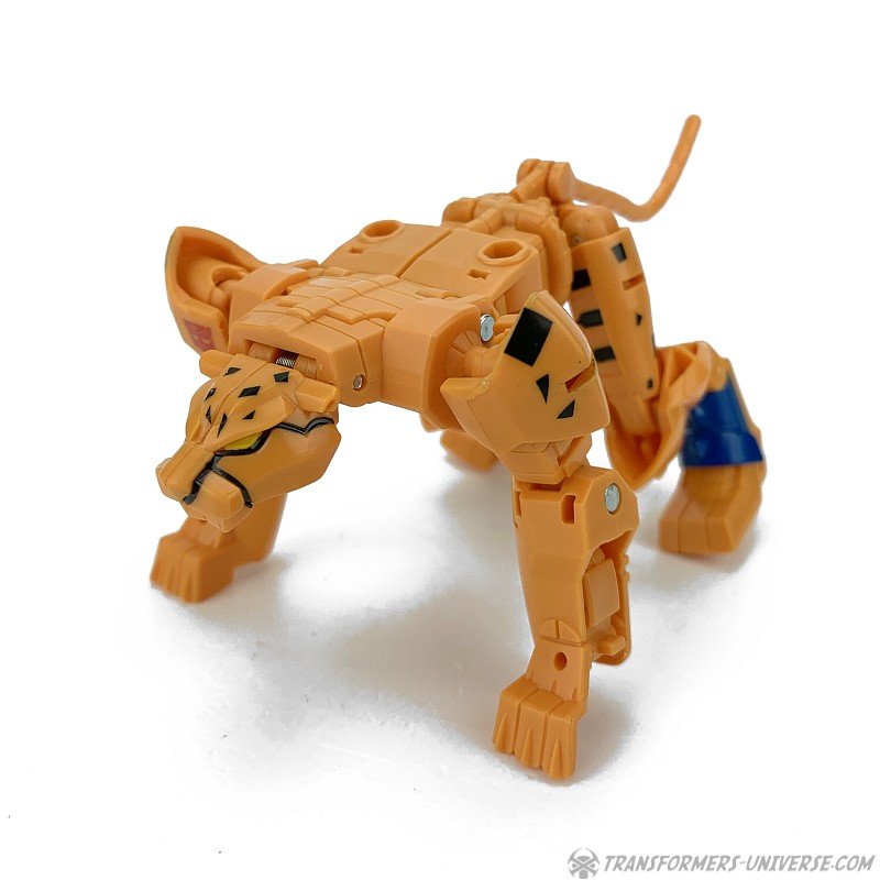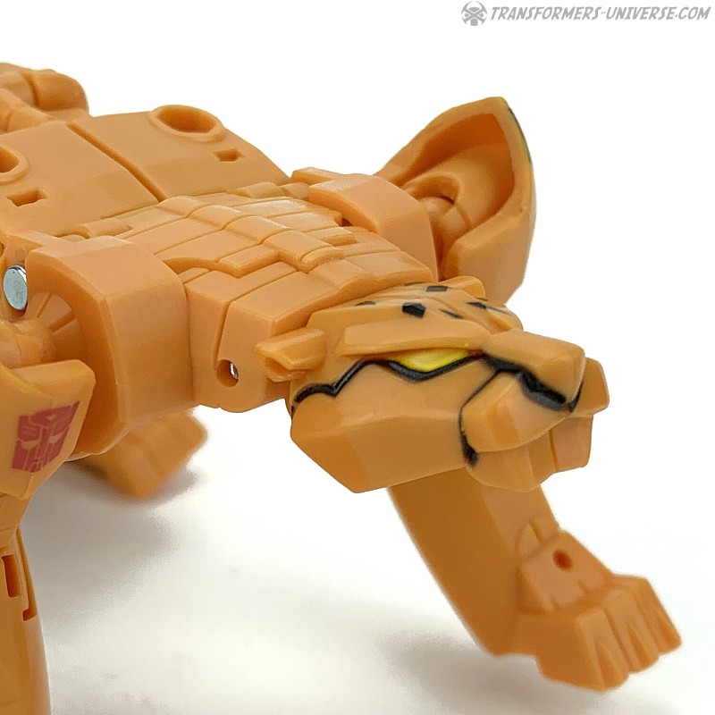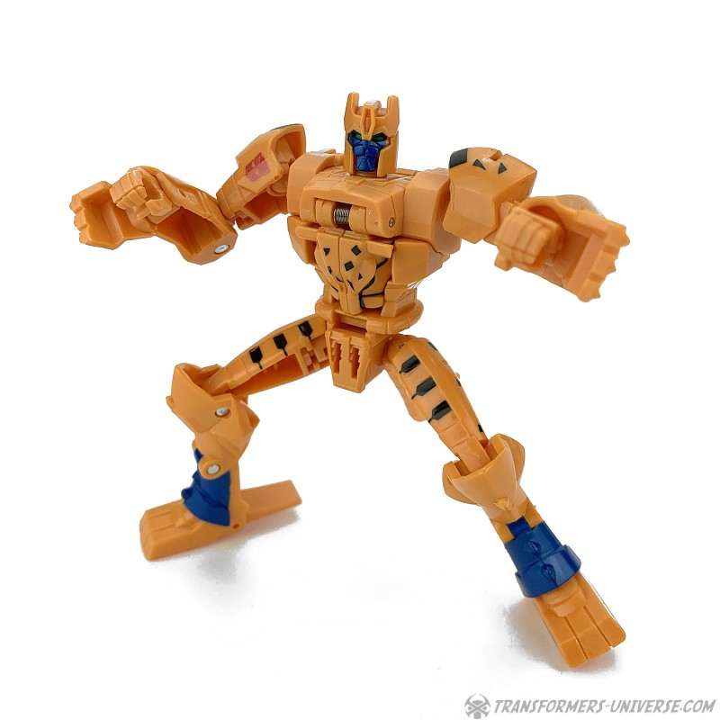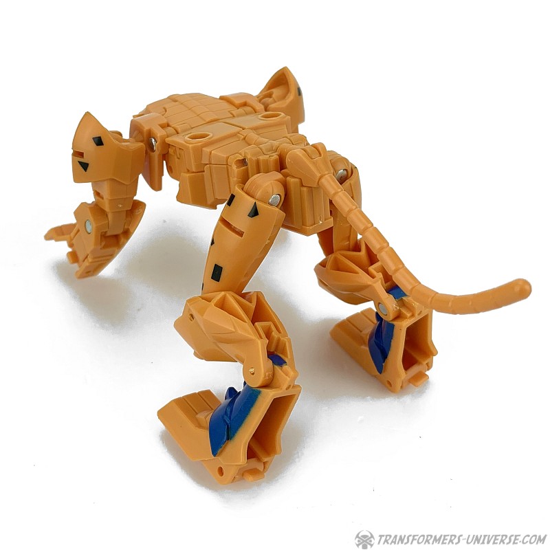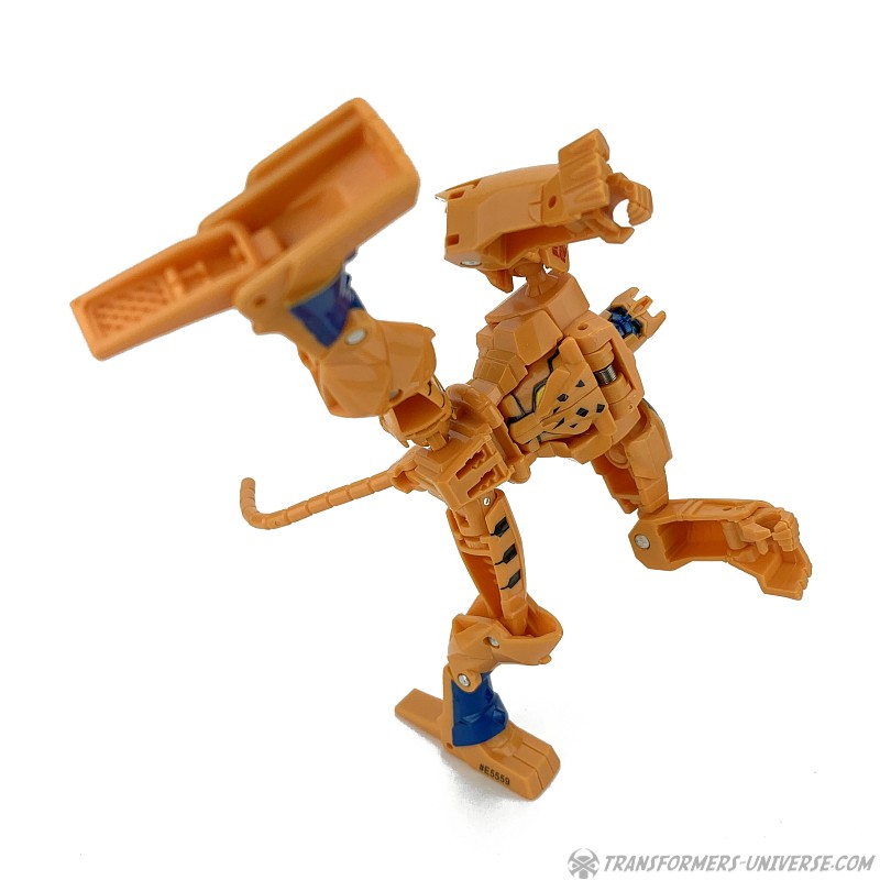 Alternativmodus: Cheetor verwandelt sich natürlich wieder in einen Geparden (engl. cheetah). Ein voll robotisch aussehender Gepard, dessen Hinterbeine etwas zu groß geraten sind im Vergleich zum Rest, aber es funktioniert trotzdem überraschend gut. Speziell wenn man mit einem Roboter ohne jede Anhängsel startet. Klar, so ganz kann die Figur nicht verhehlen, dass es ein Roboter auf allen Vieren ist, aber trotzdem: ziemlich gut für eine Gimmick-beladene Cyberverse Figur. Nur nicht so genau auf den Bauch des Geparden gucken, der ist hohl und man sieht den Hinterkopf des Robotermodus. In Summe also: ein netter Geparden-Modus. Nicht der Beste aller Zeiten, aber gut. Somit Daumen hoch.